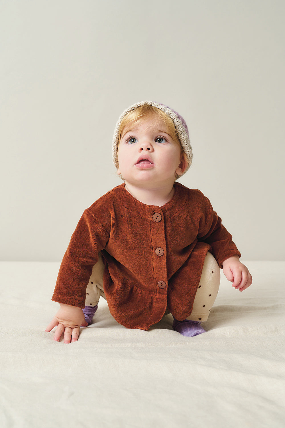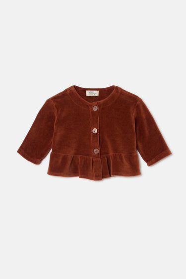 Velour jacket with a flounced hem. Button closure at front. Extra soft and warm. 83% cotton,17% polyamide. Knit