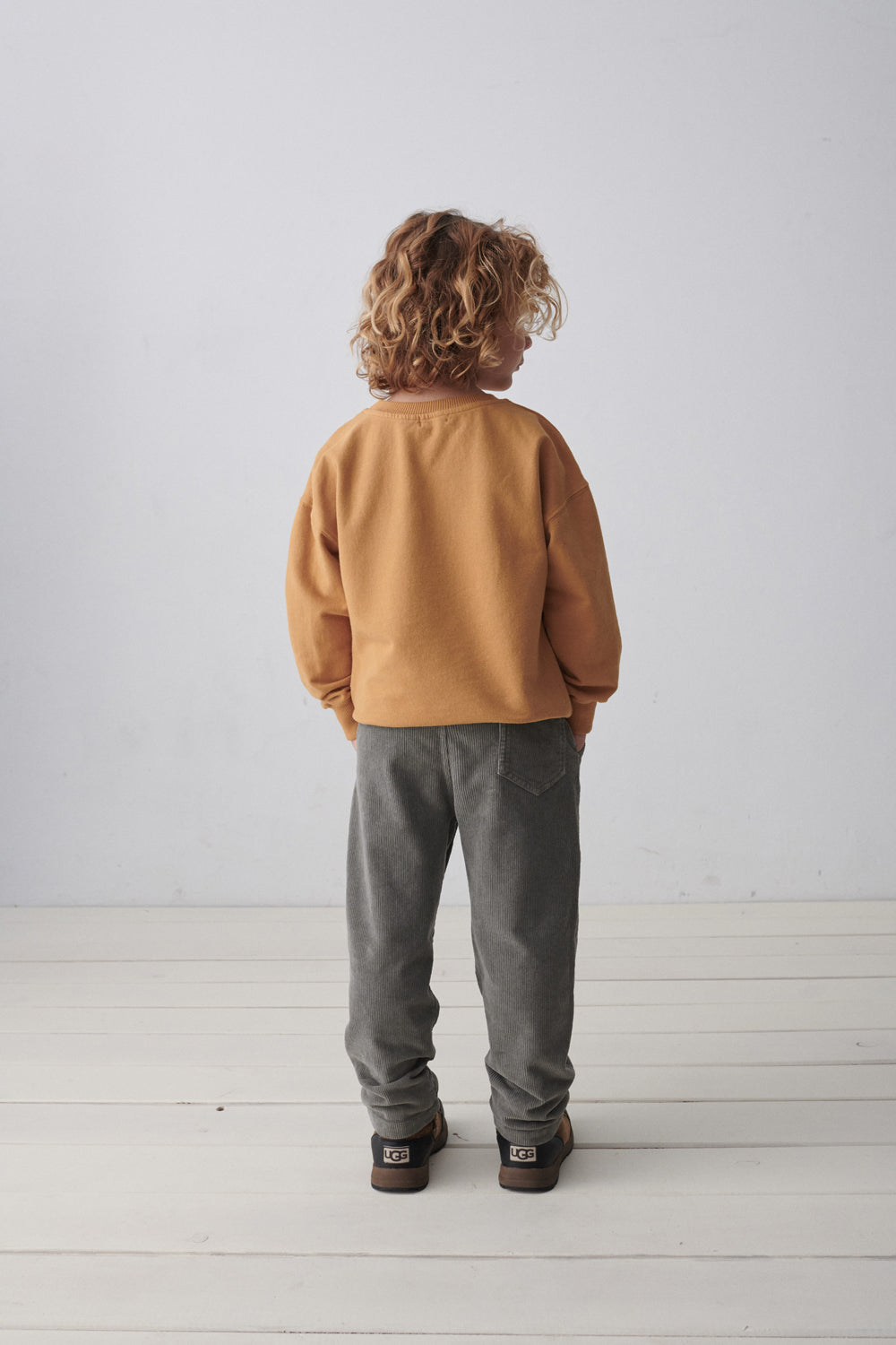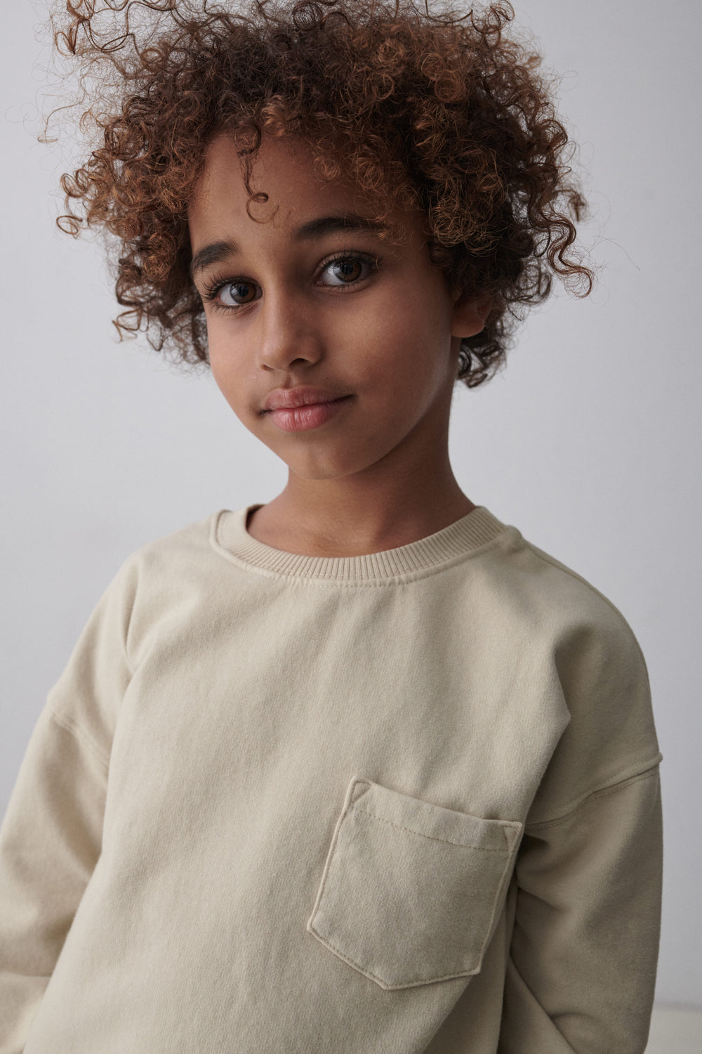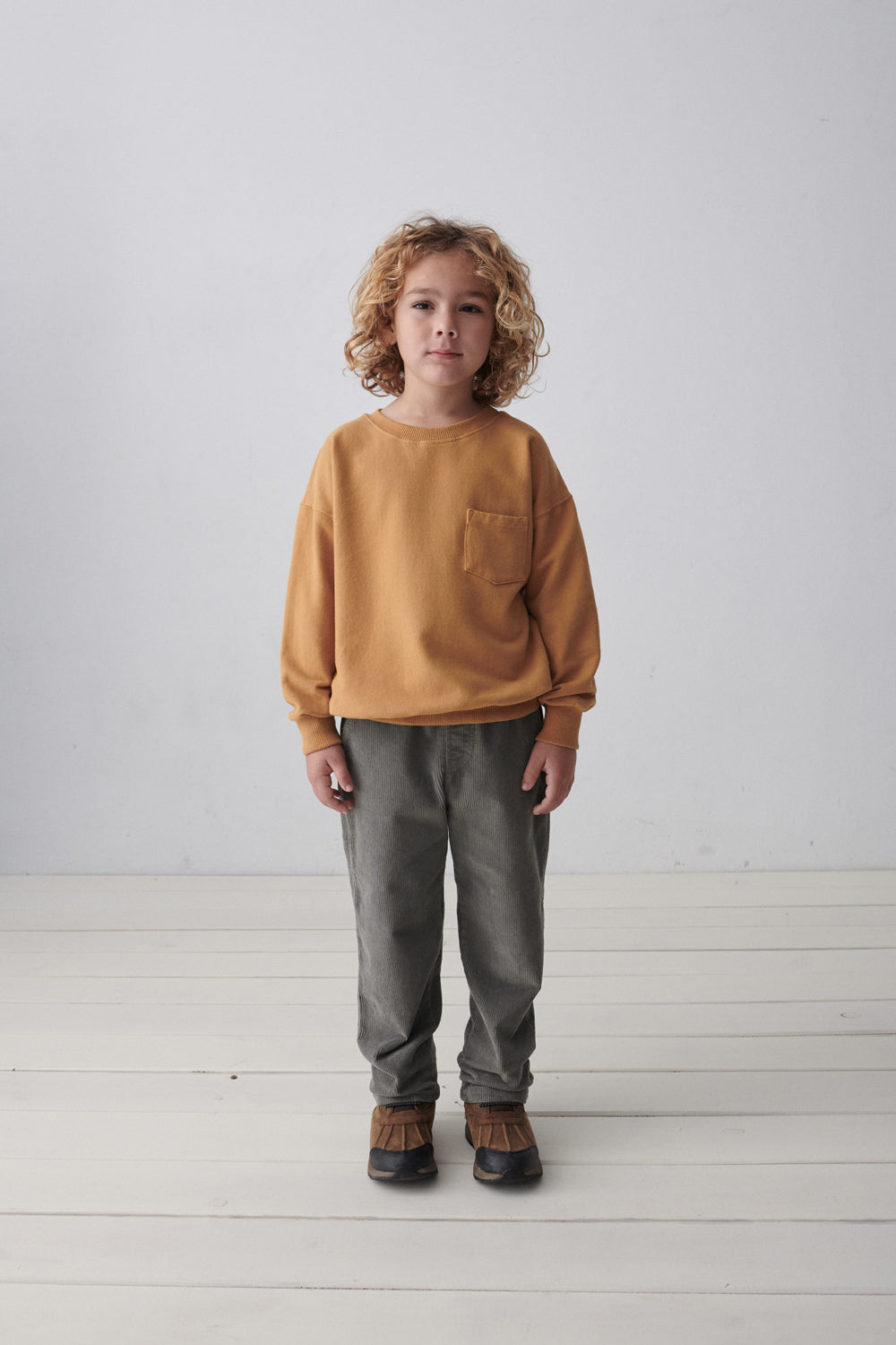 This organic sweatshirt has a crew neck, relaxed shoulders, long sleeves, rib at cuffs and hem, and a front patch pocket. Available in Blue, Brown, Dark Grey, Mustard, Stone.