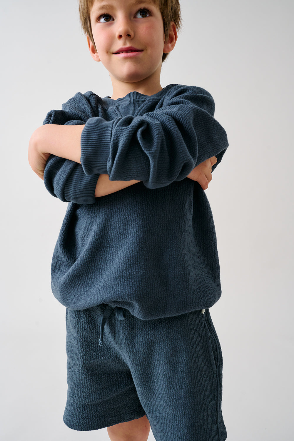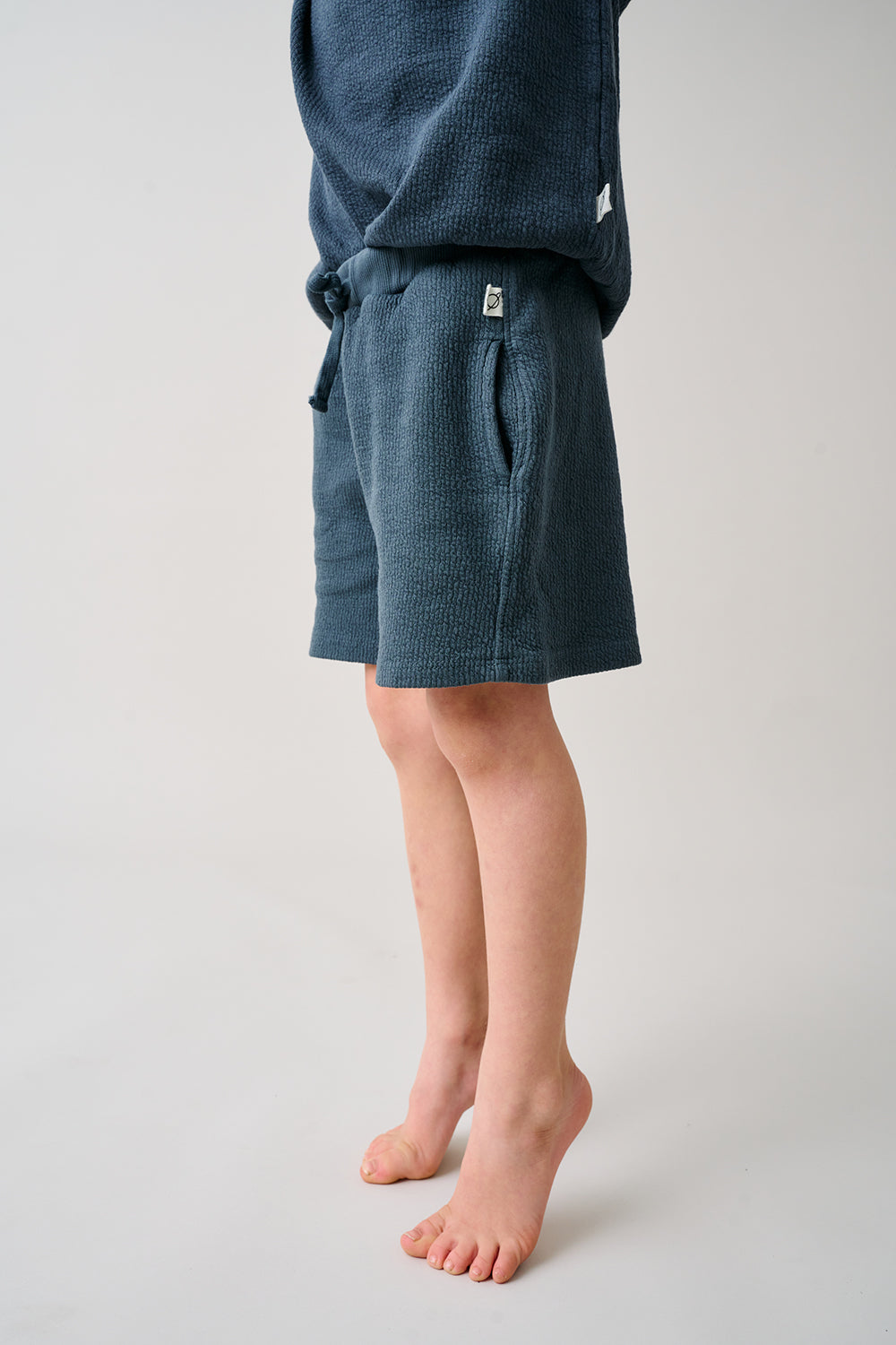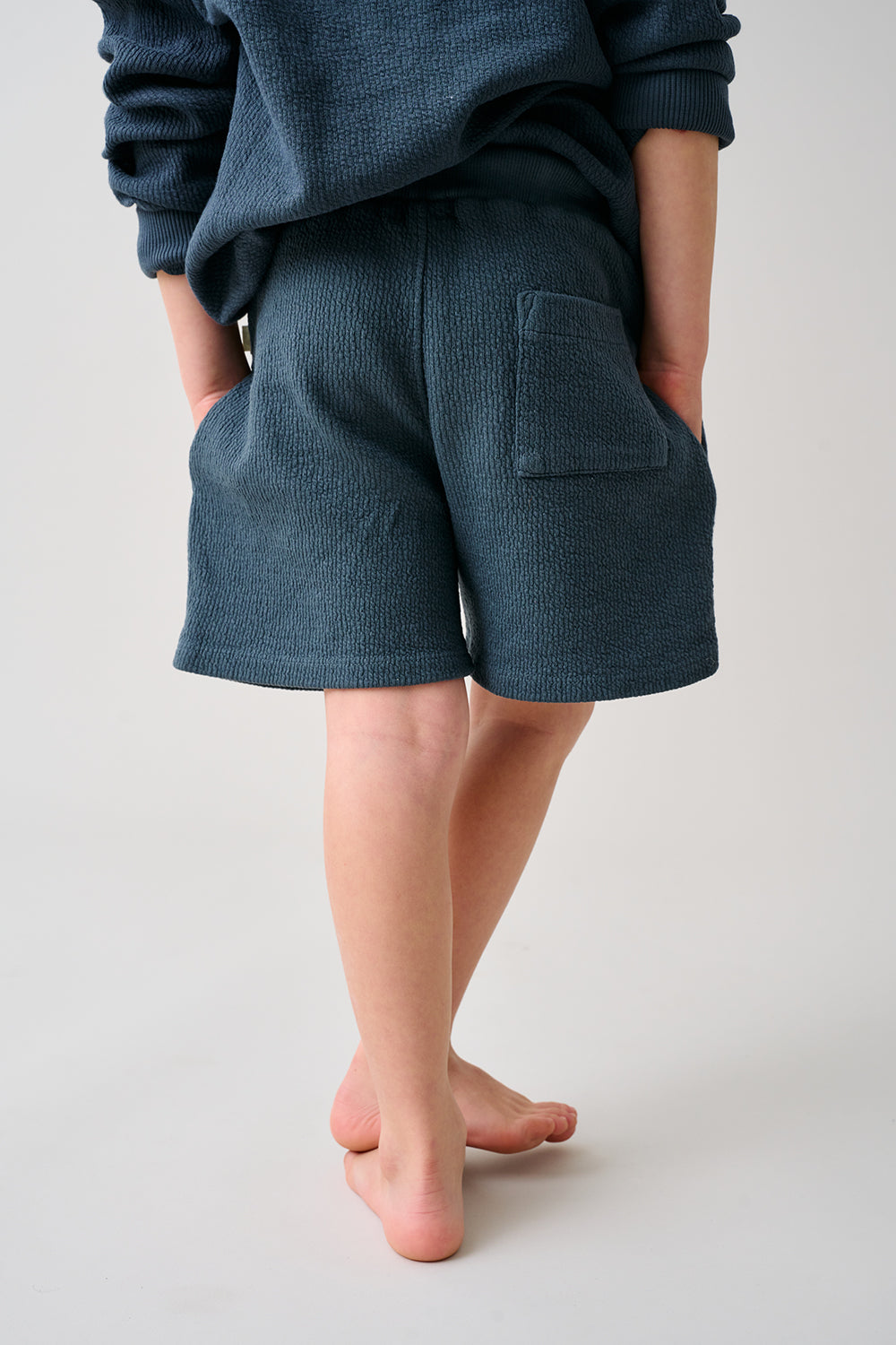 These organic, textured, double-face cotton Bermuda shorts feature a ribbed, elastic drawstring waistband. Patch pocket at the back.