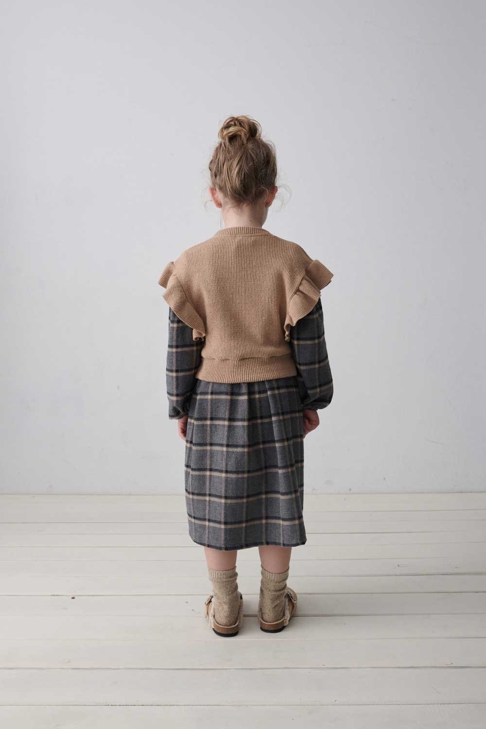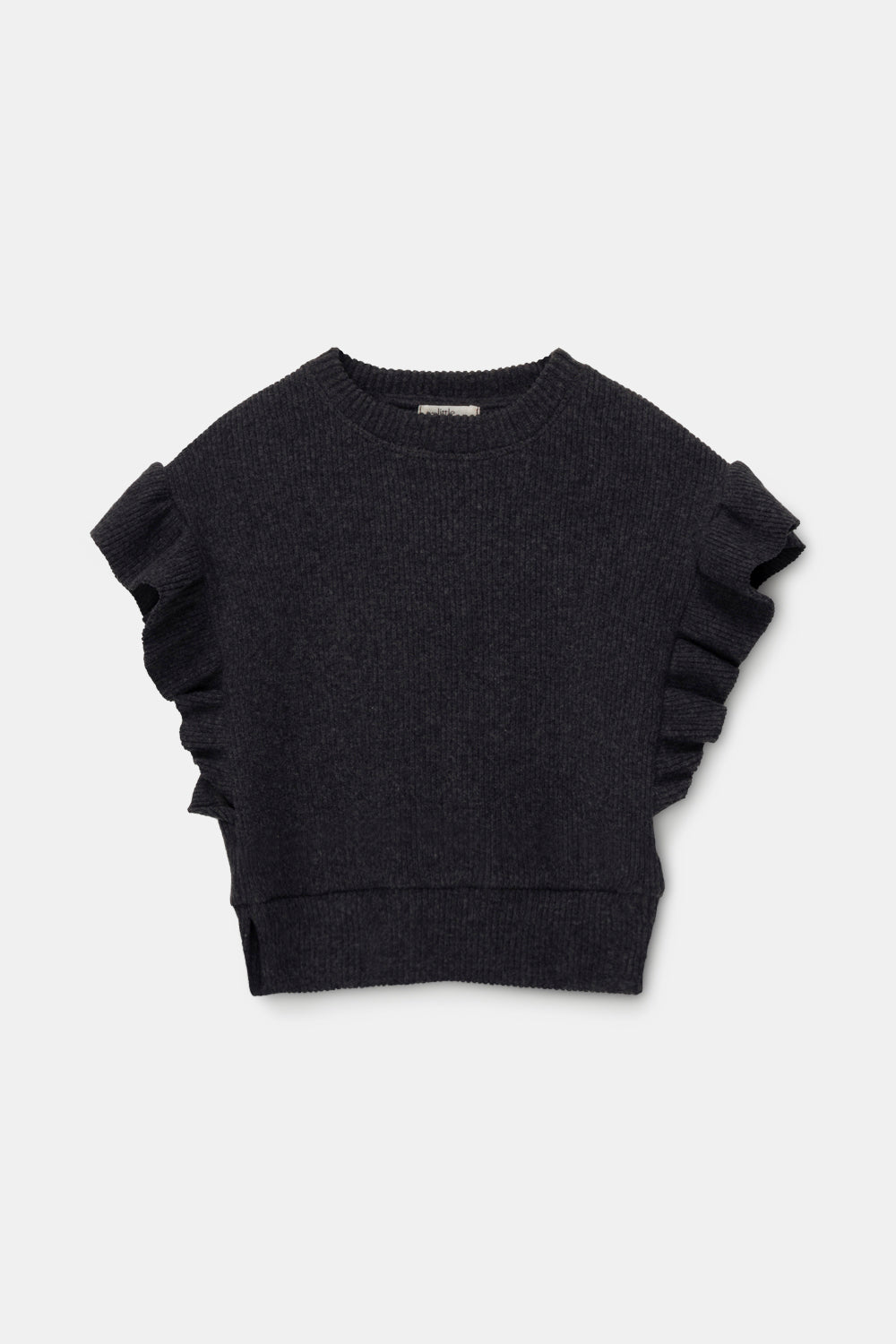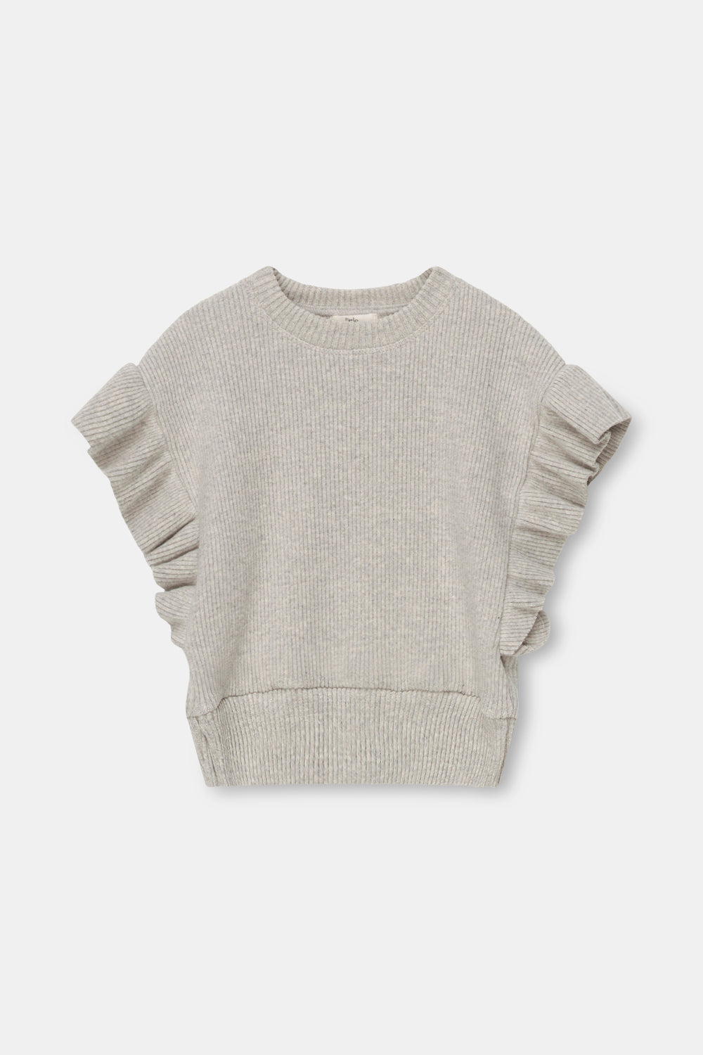 This ribbed vest features ruffles on the sides, from the shoulders to the hips. It has a crew neck and side slits.  Available in Dark Grey, Light Grey, and Camel.