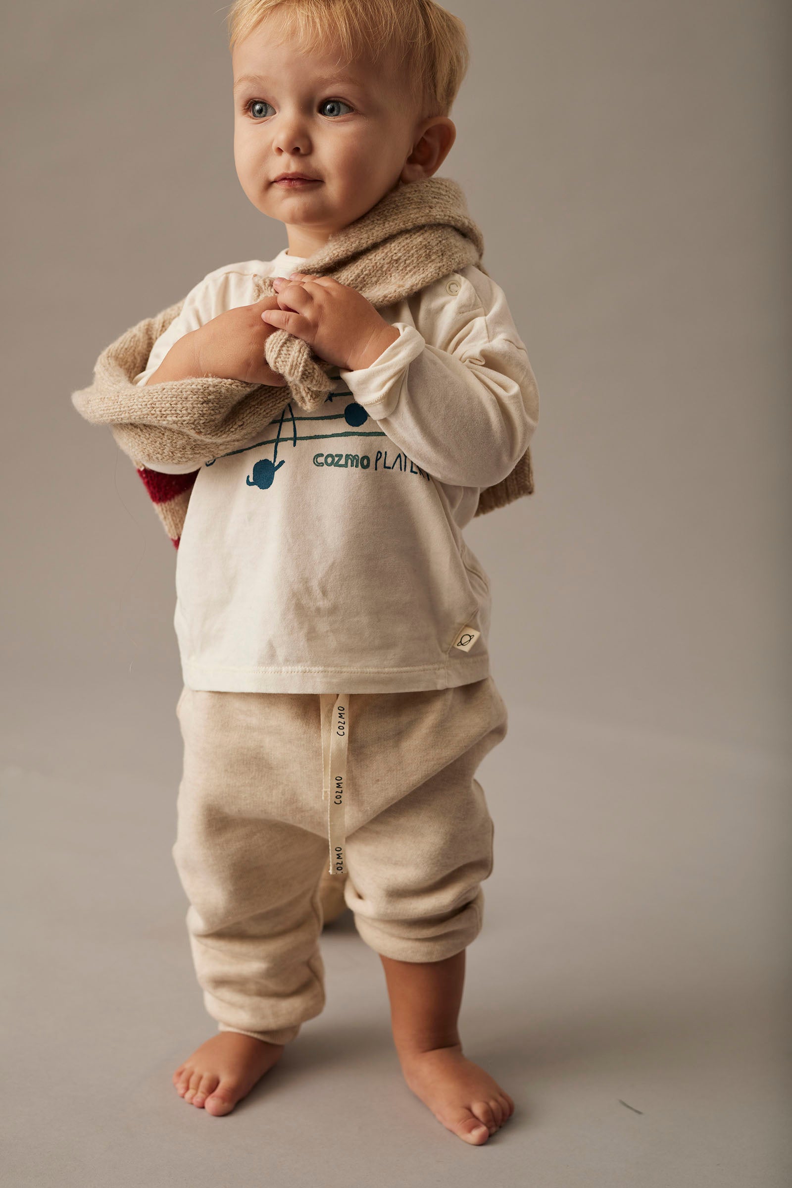These pants are made from brushed fleece with mélange yarn, offering exceptional warmth and softness. They feature an elastic waistband with a decorative "Cozmo" drawstring, ribbed hems, and a patch pocket at the back. Made from 100% cotton, they provide cozy comfort for cooler days.
