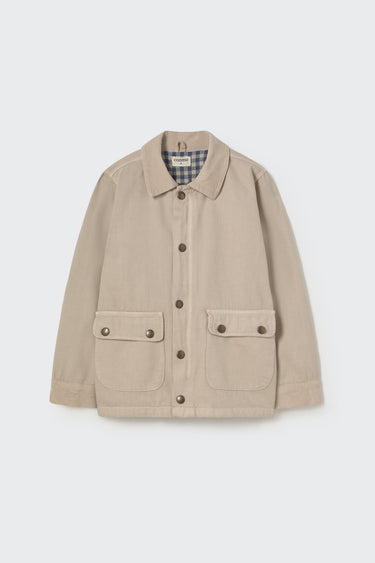 This kids’ jacket is made from GOTS-certified organic cotton twill with an ultra-smooth feel. It features a double closure with a zipper and tack buttons, and flap patch pockets at the front. The collar and cuffs are finished in matching corduroy for added texture. Fully lined in soft plaid fabric for comfort and warmth.