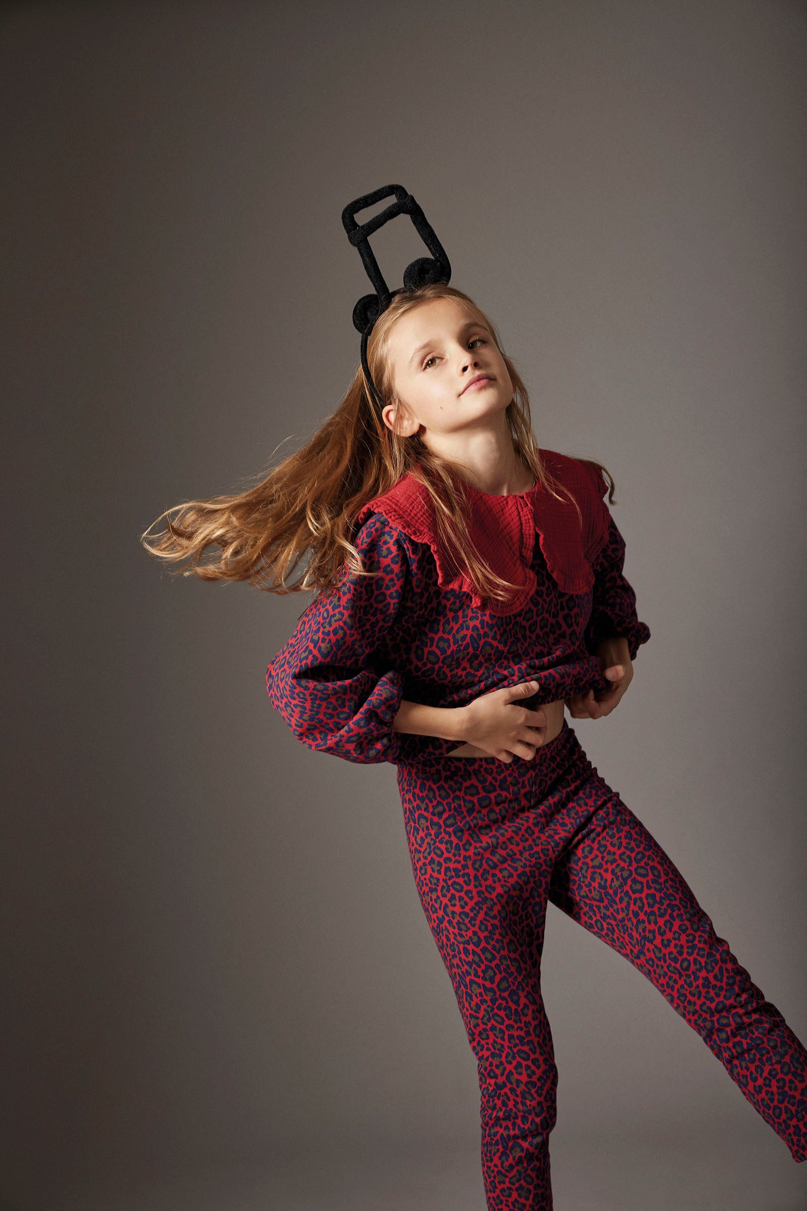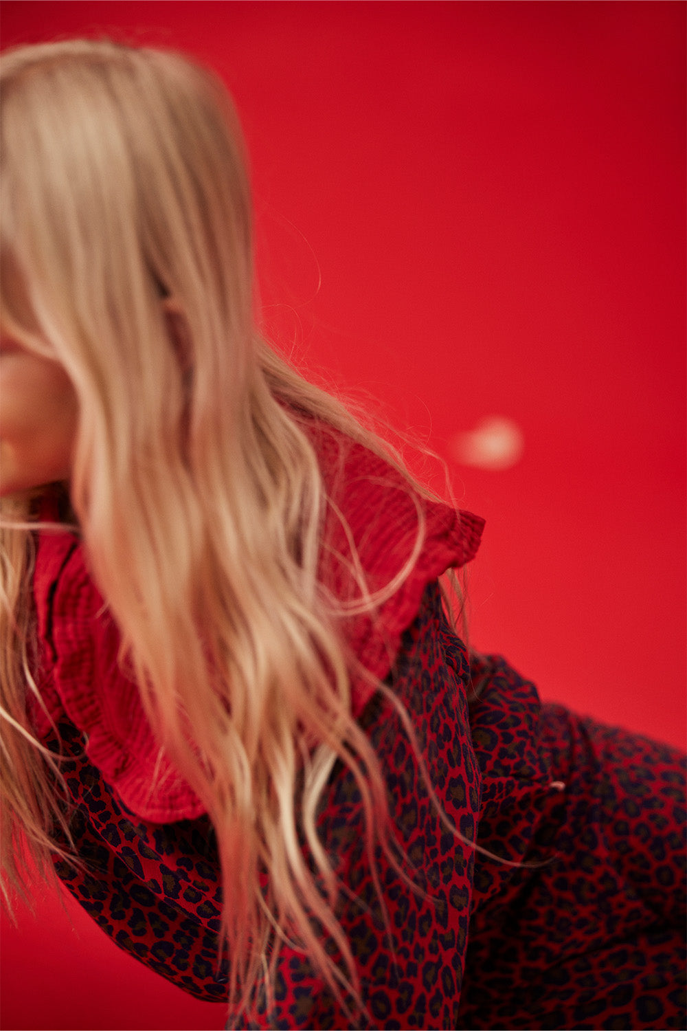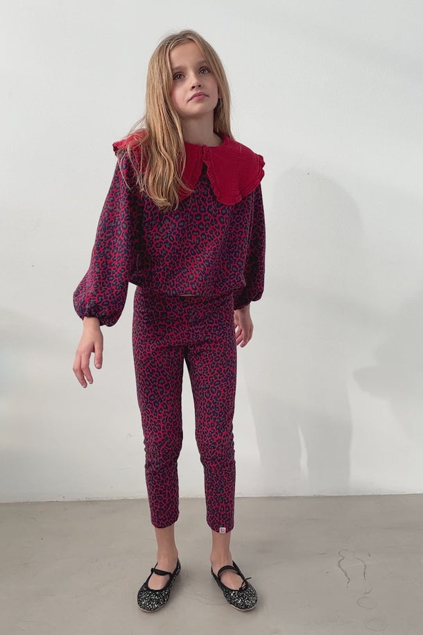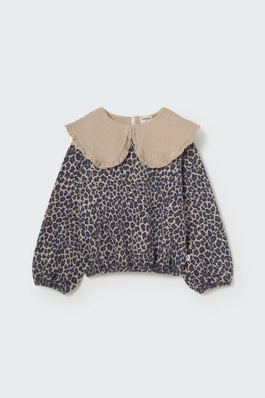 Sweatshirt for girls in premium brushed GOTS-certified organic cotton fleece. Designed with an oversized Peter Pan collar in a solid color, finished with delicate ruffle trim for a charming touch. Features puffed long sleeves with elasticized cuffs and an elastic hem for a soft, gathered fit. All-over animal print.