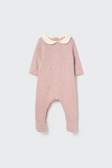 This striped jumpsuit for newborns is crafted from double-faced soft jersey in 100% cotton—gentle, breathable, and perfect for delicate skin. It features a charming solid-colored Peter Pan collar, long sleeves, and cozy footed legs for full-body comfort. Snap buttons along the back and legs make dressing and diaper changes quick and easy. A timeless, cozy essential for your newborn’s first wardrobe.
