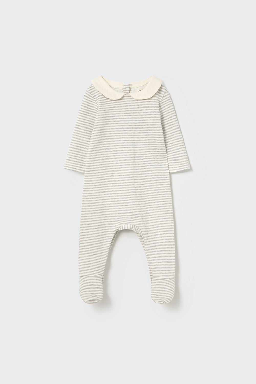 This striped jumpsuit for newborns is crafted from double-faced soft jersey in 100% cotton—gentle, breathable, and perfect for delicate skin. It features a charming solid-colored Peter Pan collar, long sleeves, and cozy footed legs for full-body comfort. Snap buttons along the back and legs make dressing and diaper changes quick and easy. A timeless, cozy essential for your newborn’s first wardrobe.