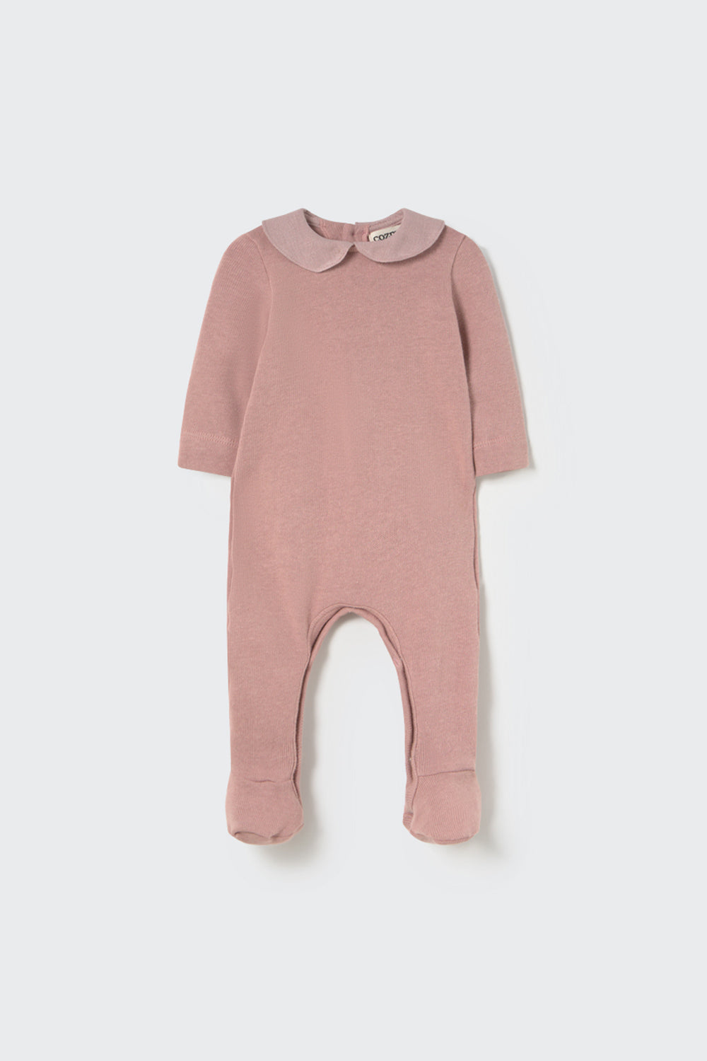 Newborn jumpsuit crafted from buttery-soft knit, brushed inside and out for exceptional warmth and comfort. Features a contrasting mélange flannel Peter Pan collar and convenient back buttons. Footed legs with snap buttons make dressing and changing quick and easy, keeping your baby cozy all day long.
