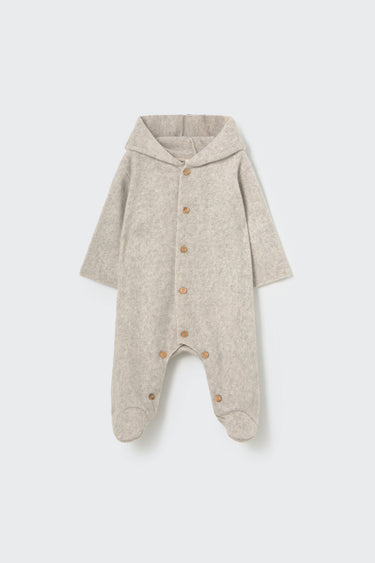 This hooded bearsuit is crafted from tender bamboo fabric with a soft mélange effect, designed for newborns. Featuring convenient buttons down the front and along the footed legs, it ensures easy dressing and changing while providing gentle warmth and comfort. Part of our bamboo newborn clothes collection.