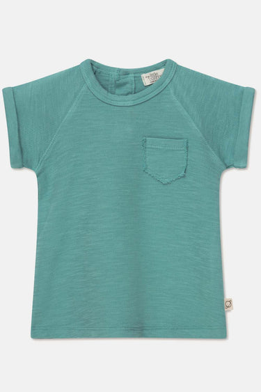 Organic baby dress, featuring a crew neck, front patch pocket, and button closure.