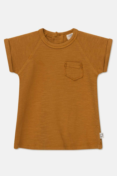 Organic baby dress, featuring a crew neck, front patch pocket, and button closure.