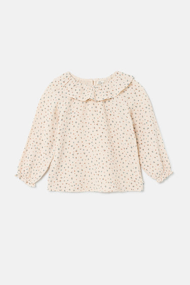 Soft gauze blouse in an allover floral Liberty print. Crew neck with an overlocked, rounded flounce. Long, raglan sleeves with elastic cuffs. Teardrop closure at back. Wrinked effect. 100% cotton. Woven