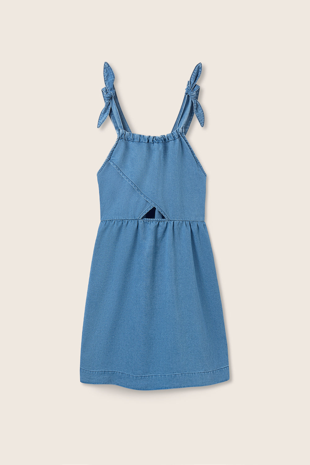 Girls’ denim dress in lightweight chambray. It features knotted shoulder straps, a round neckline, and a crossover front with an optional cut-out at the waist (dress available in both options). Gathered at the waistline with a smocked back panel for a comfortable fit.