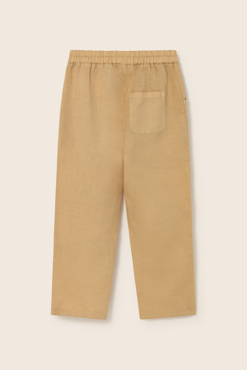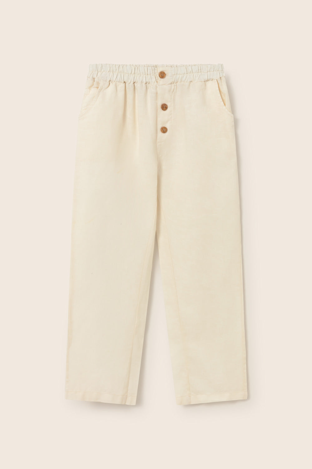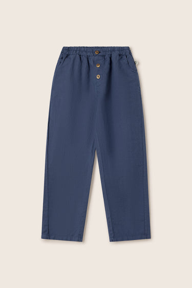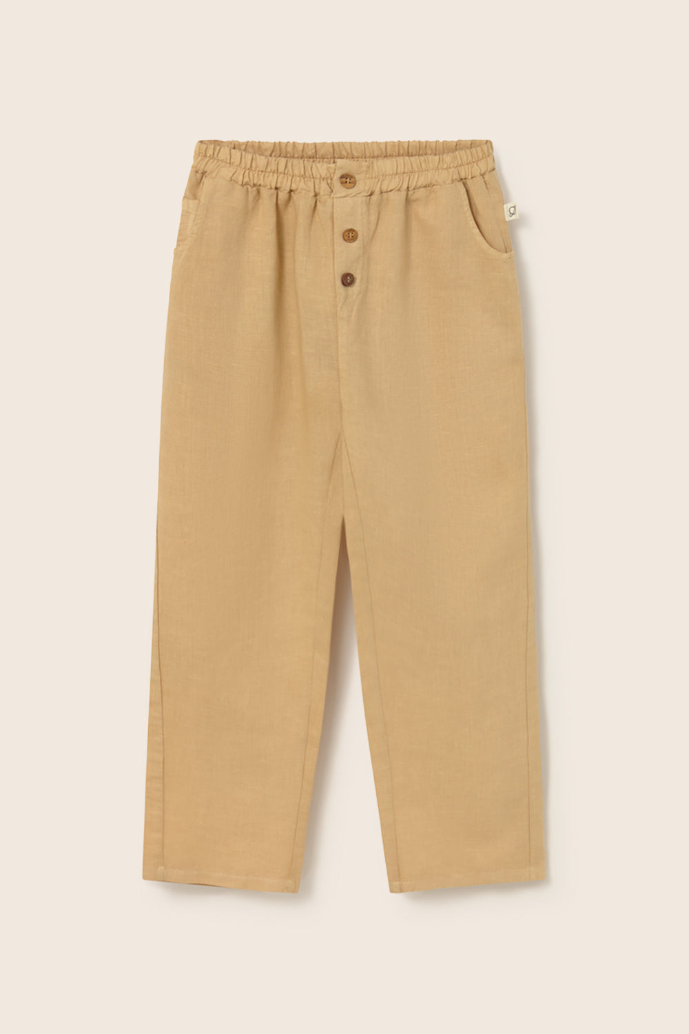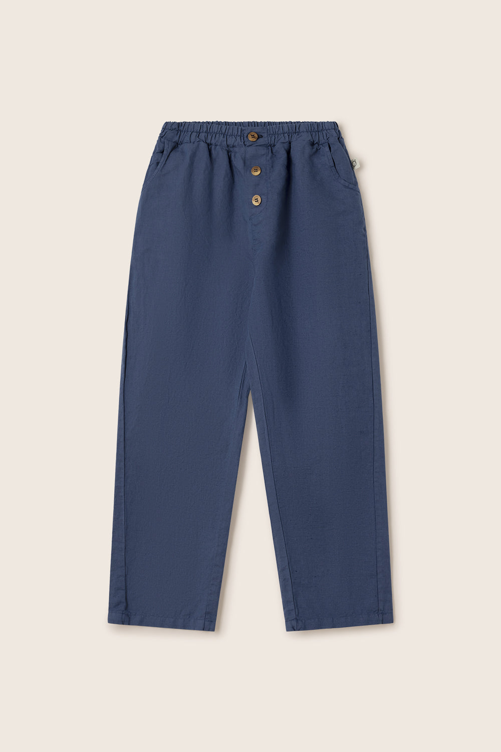 Boys’ pants made from a breathable cotton-linen blend. They feature an elastic waistband, decorative buttons with a mock fly, side pockets including a coin pocket, and a back patch pocket. Finished with slightly forward seams.