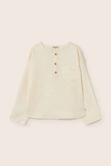 Boys’ shirt made from a breathable cotton-linen blend. It features a round neckline, a front button placket, and long sleeves. Finished with a chest patch pocket and a rounded hem for a comfortable fit.