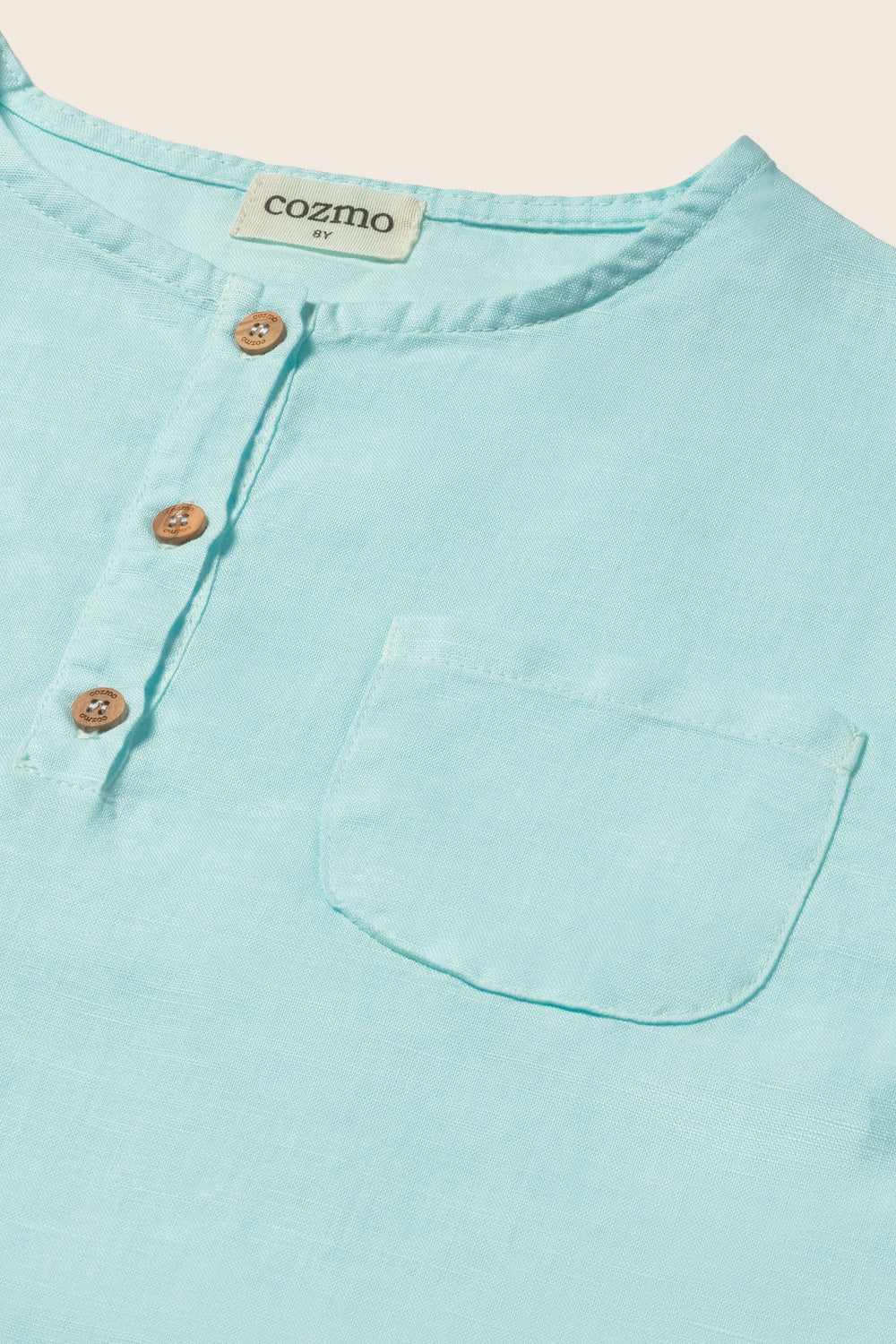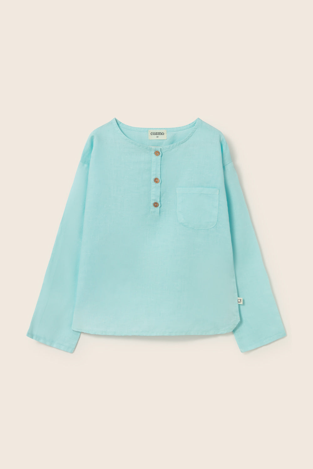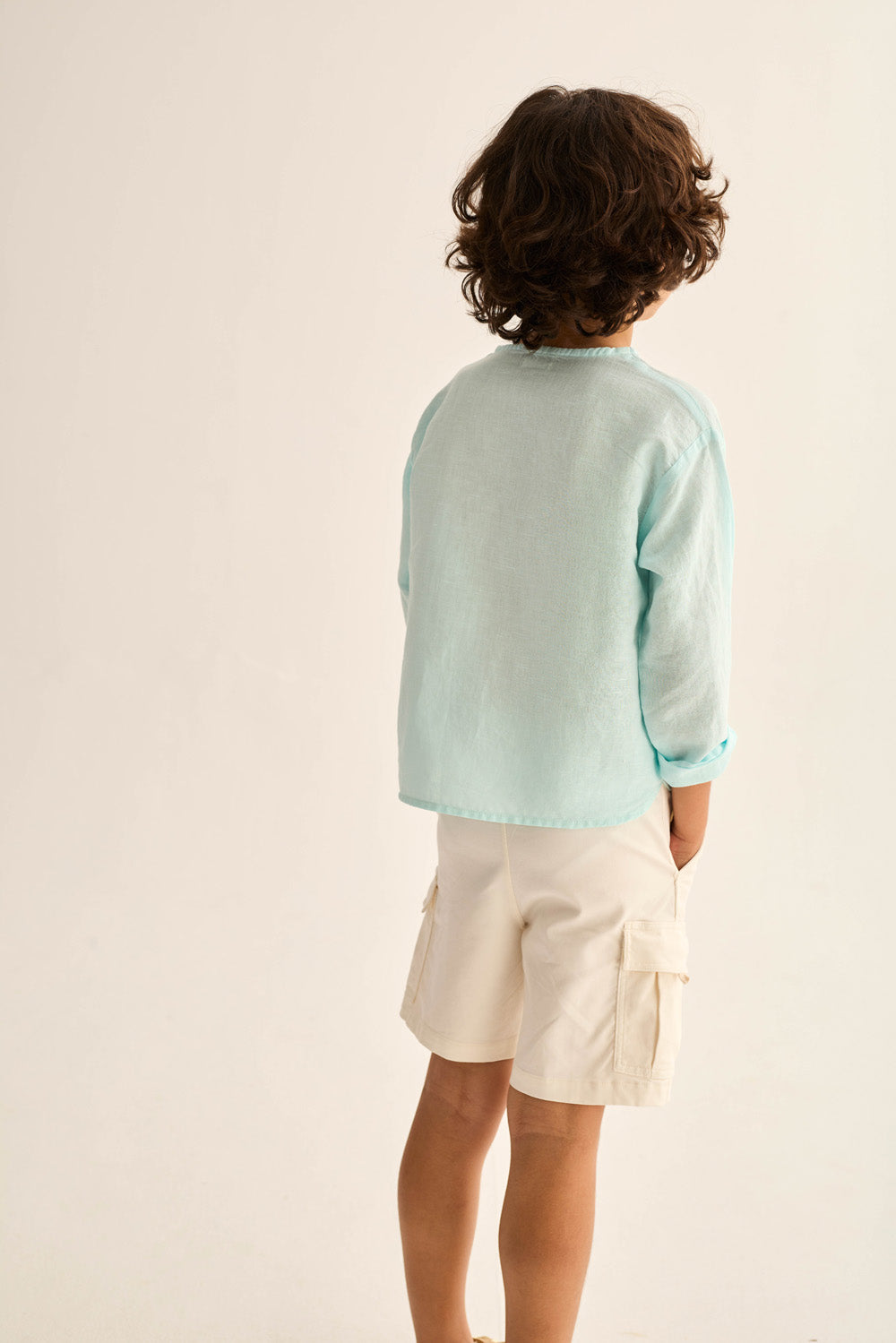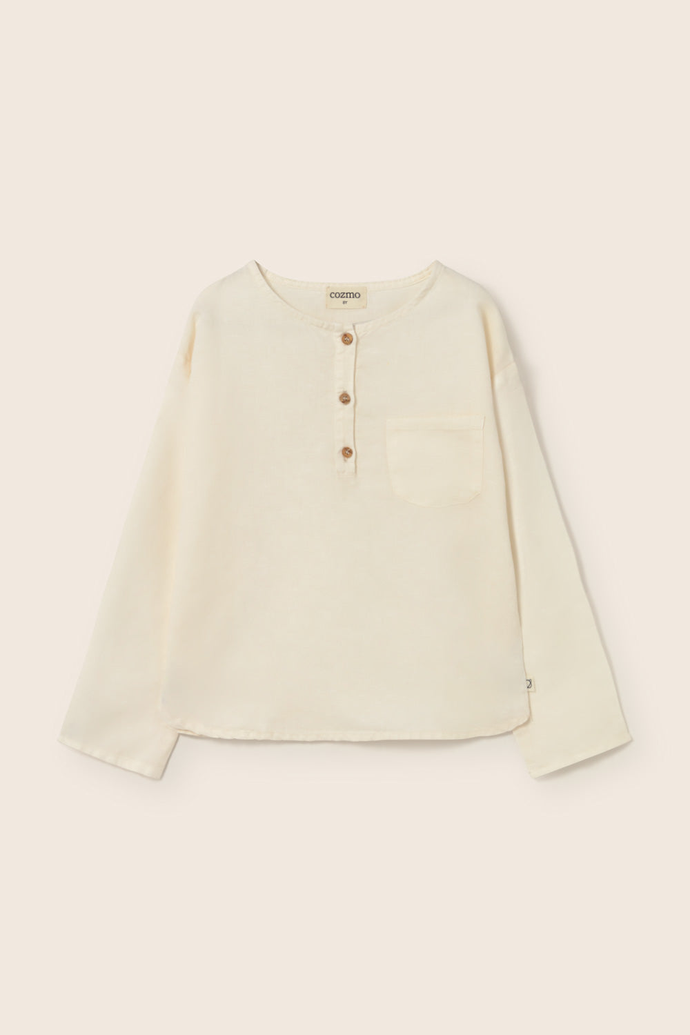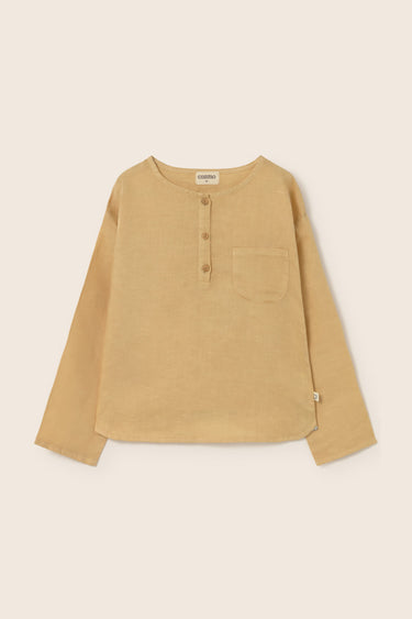 Boys’ shirt made from a breathable cotton-linen blend. It features a round neckline, a front button placket, and long sleeves. Finished with a chest patch pocket and a rounded hem for a comfortable fit.