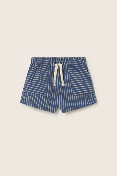 Boys’ striped shorts made from cotton fabric with a linen-like texture. They feature an elastic waistband with a decorative drawstring and front patch pockets with horizontal stripes for a classic, comfortable fit.
