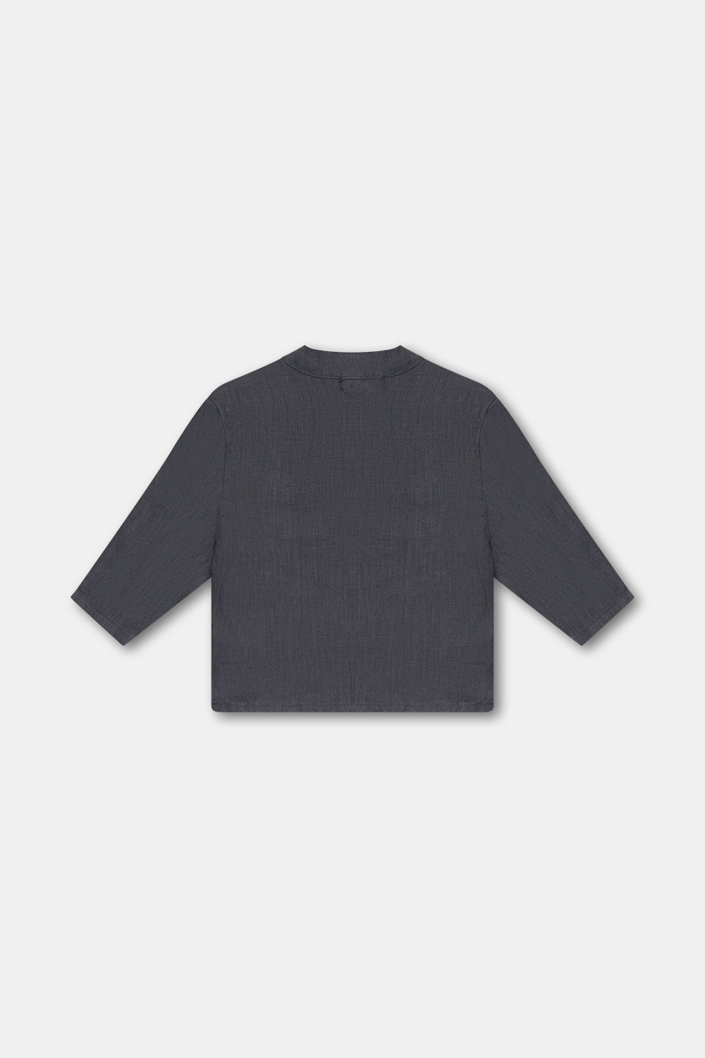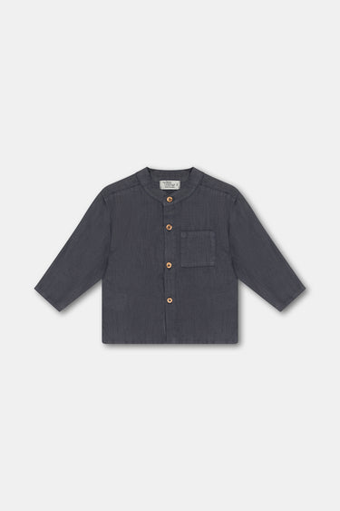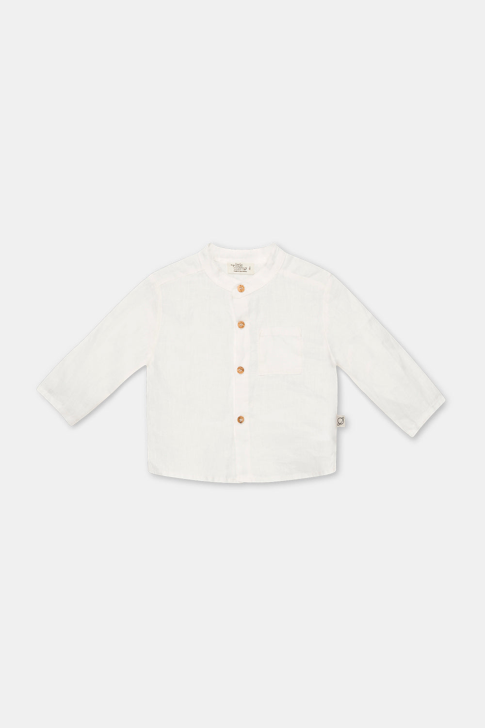 Linen baby shirt with a mao collar, long sleeves, a button placket at the front, side slits, and a patch pocket at the front.