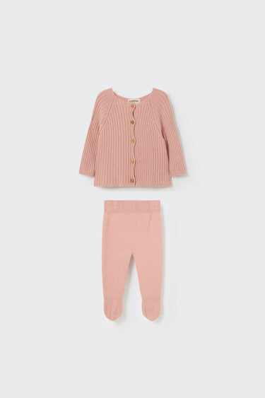 Set of 2 pieces: ribbed cardigan in lightweight tricote viscose (round neckline, raglan long sleeves, and wood buttons at the front. Seamless for extra comfort) and footed pants in the same fabric (ribbed waistline. Seamless for an increased freedom of movement).