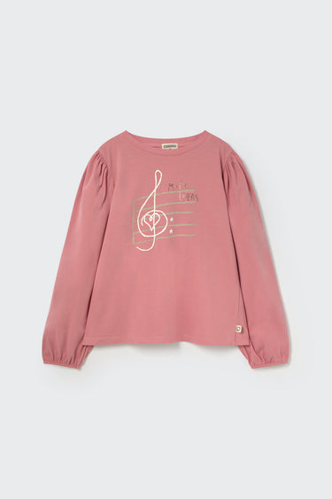 This T-shirt is part of our organic cotton girls’ clothes collection, made from toasty jersey fabric. It features gathered, puffed shoulders and elasticized cuffs. The front displays a printed musical staff, treble clef, and the message "Music Lovers." Brushed on the outside for a soft, comforting feel.