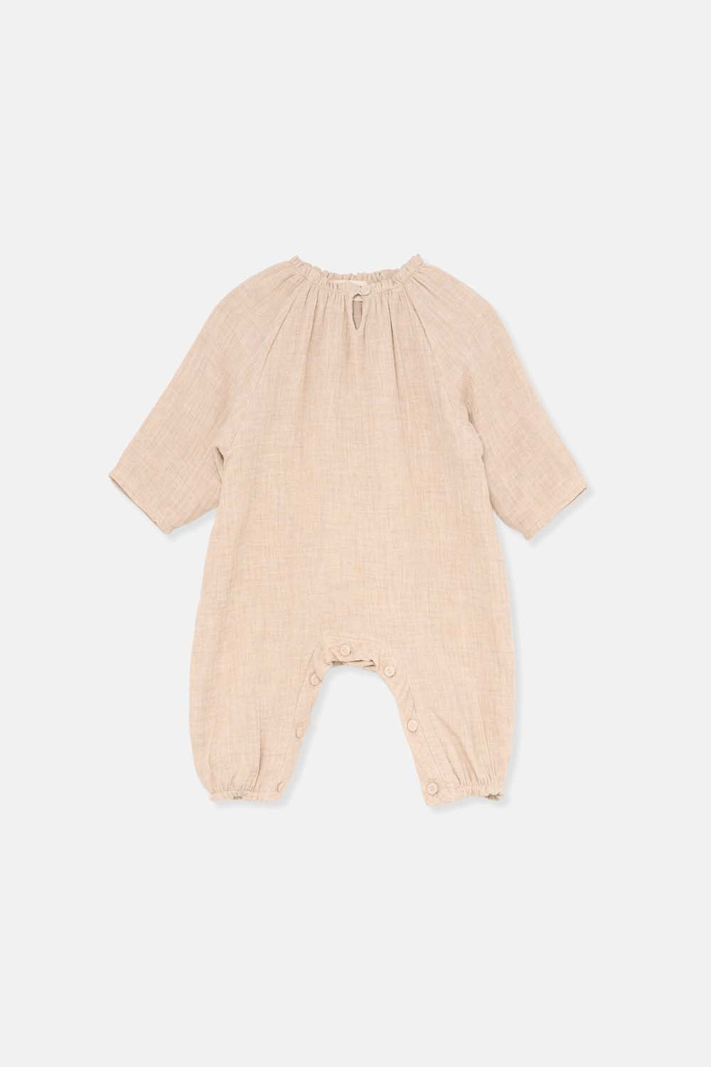 Dress babies in this snug newborn jumpsuit. It’s made from soft and fluffy organic cotton, perfect for sensitive skin. The delicate liberty floral print adds a touch of charm and whimsy. Also available in solid beige. It’s cute, practical, and versatile for any occasion. This jumpsuit offers cozy comfort and style in one sweet package, ideal for your little one's daily adventures.