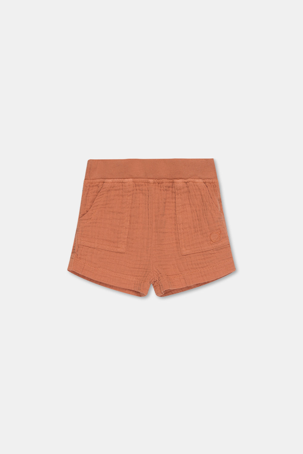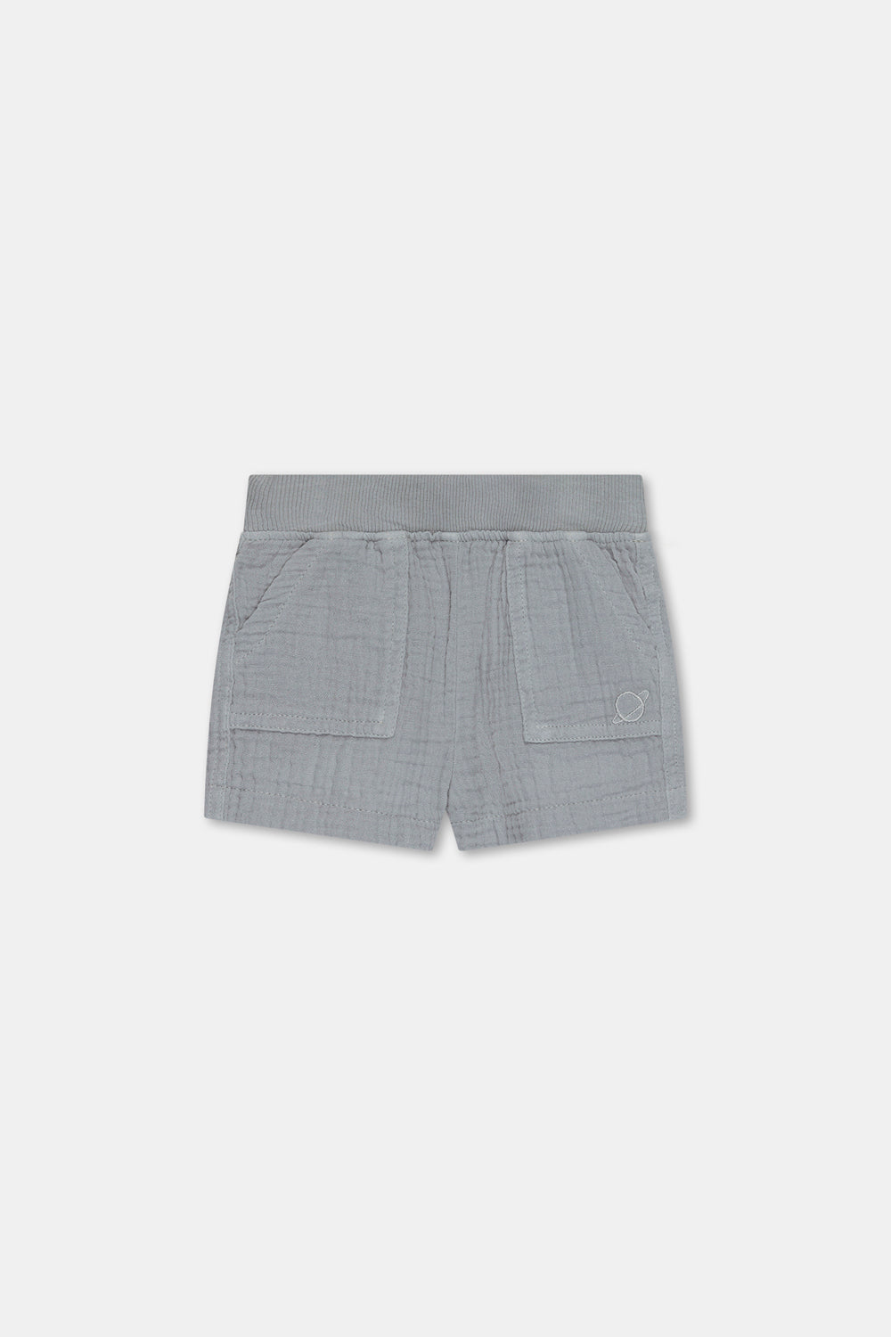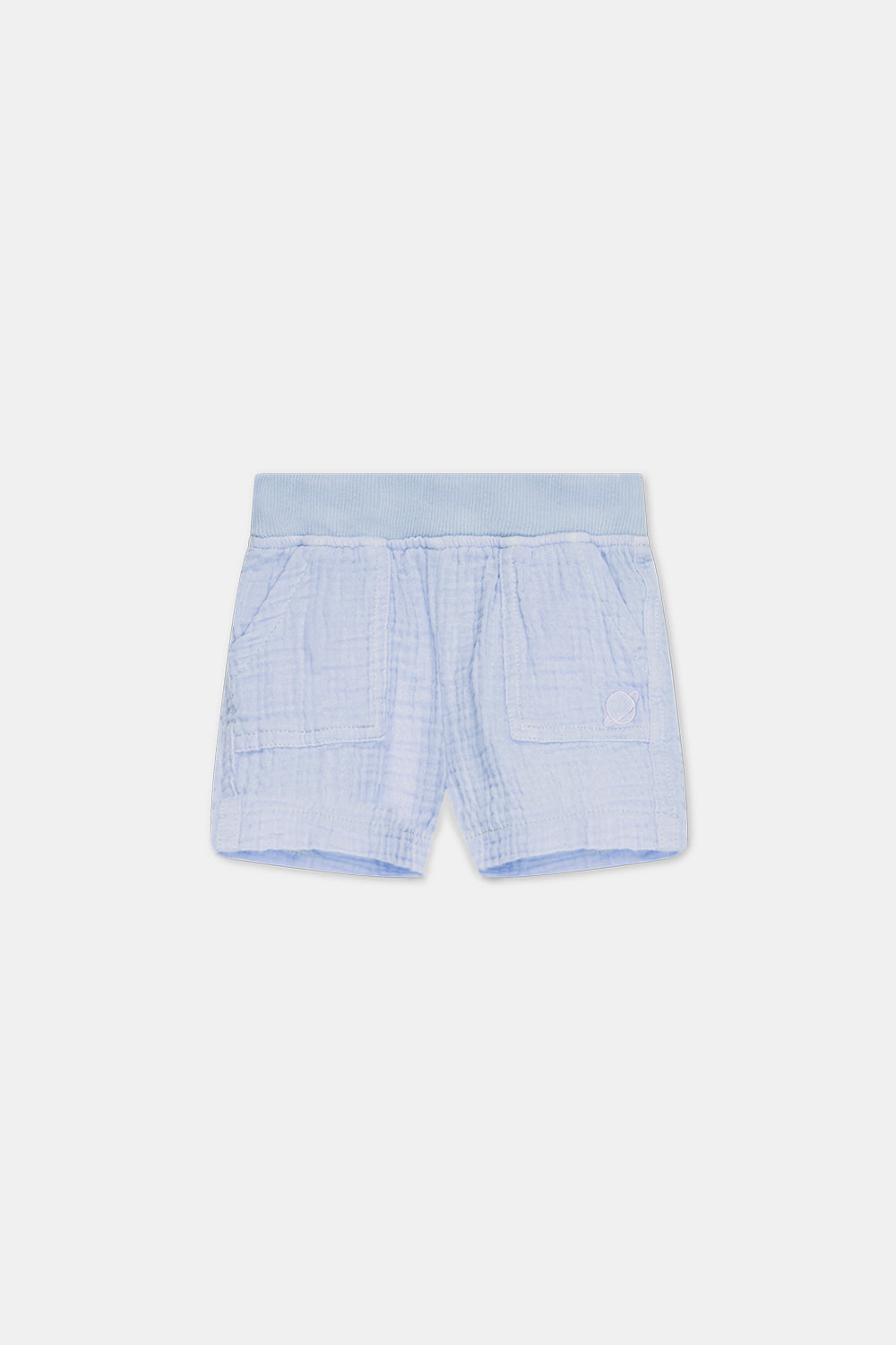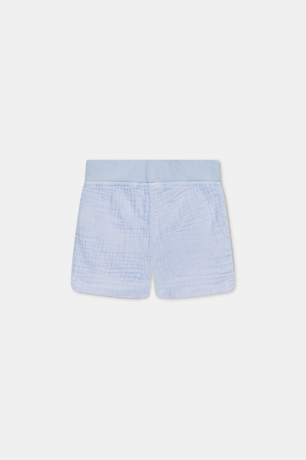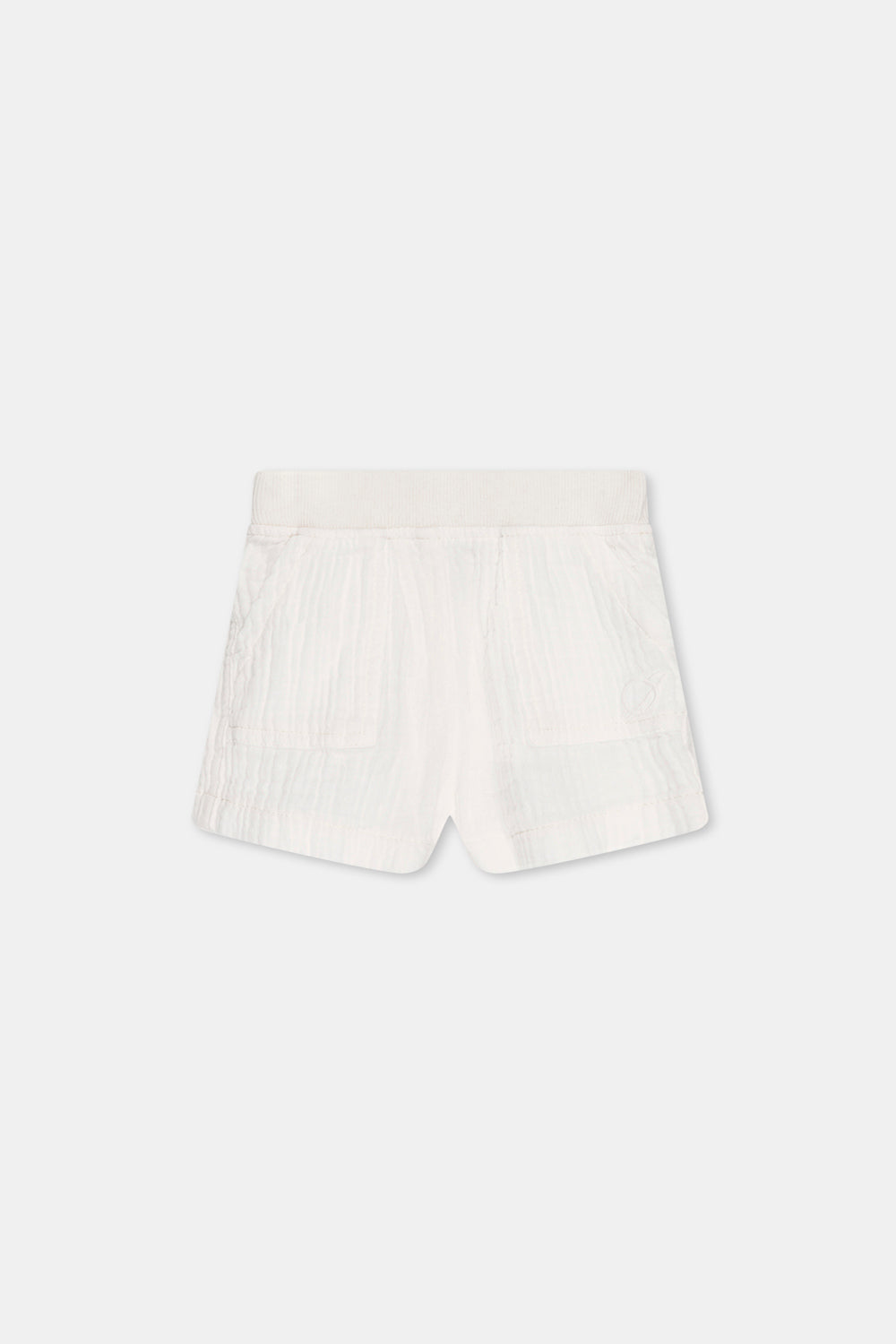 Organic gauze Bermuda shorts with rectangular patch pockets and diagonal openings. Elasticized, ribbed waistband.