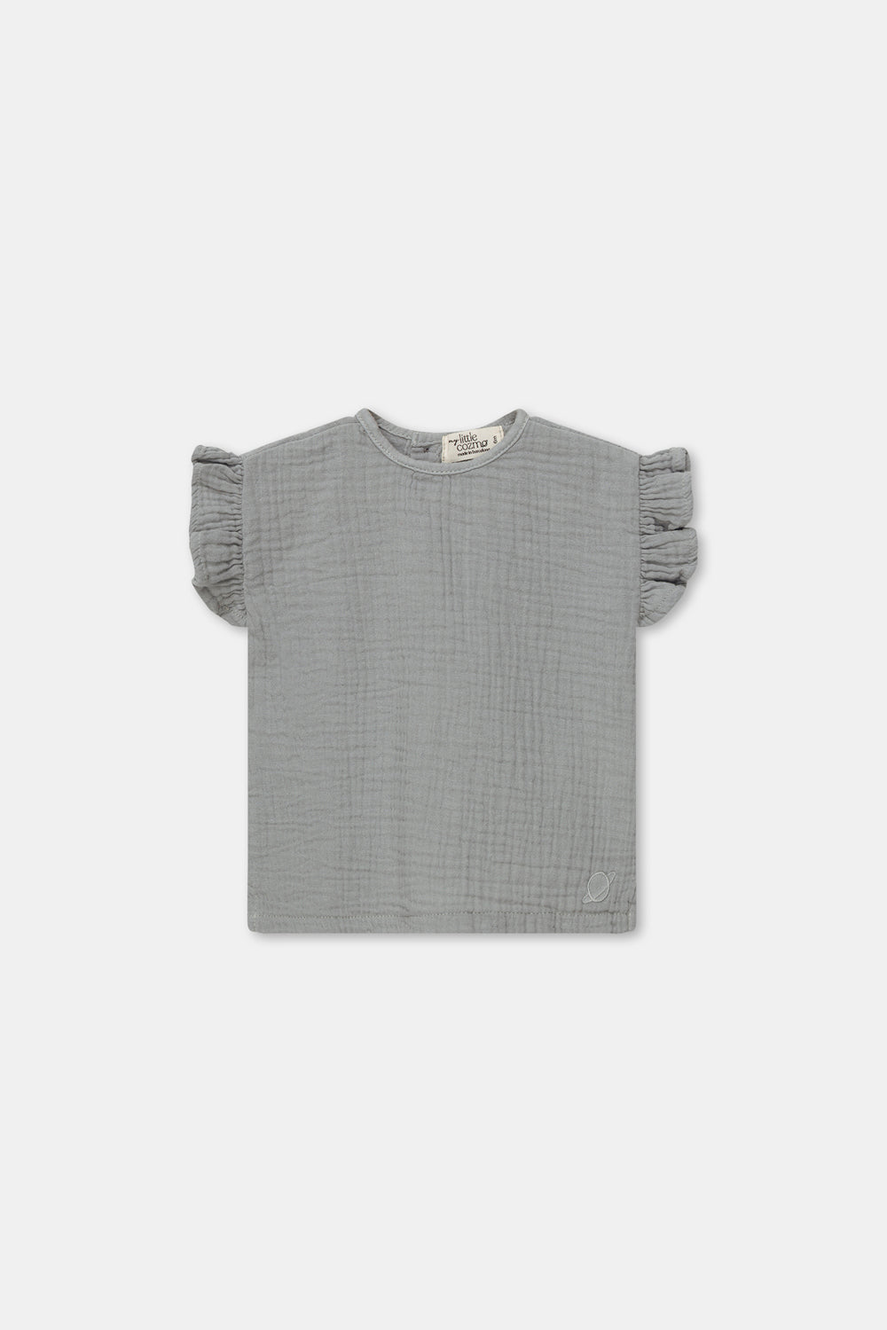 Organic gauze T-shirt with dropped shoulders, ruffles at the sleeves, side slits, and snap closure at the back.