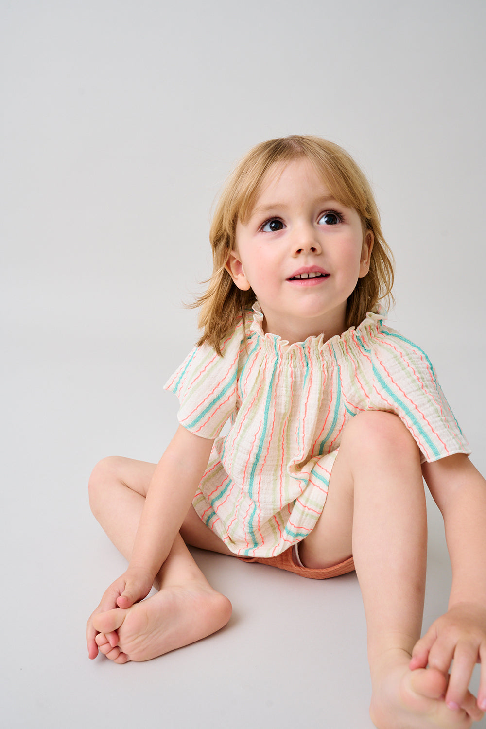 Muslin, straight, striped dress with smocking detail at the neck. Lettuce-edge at the sleeves.