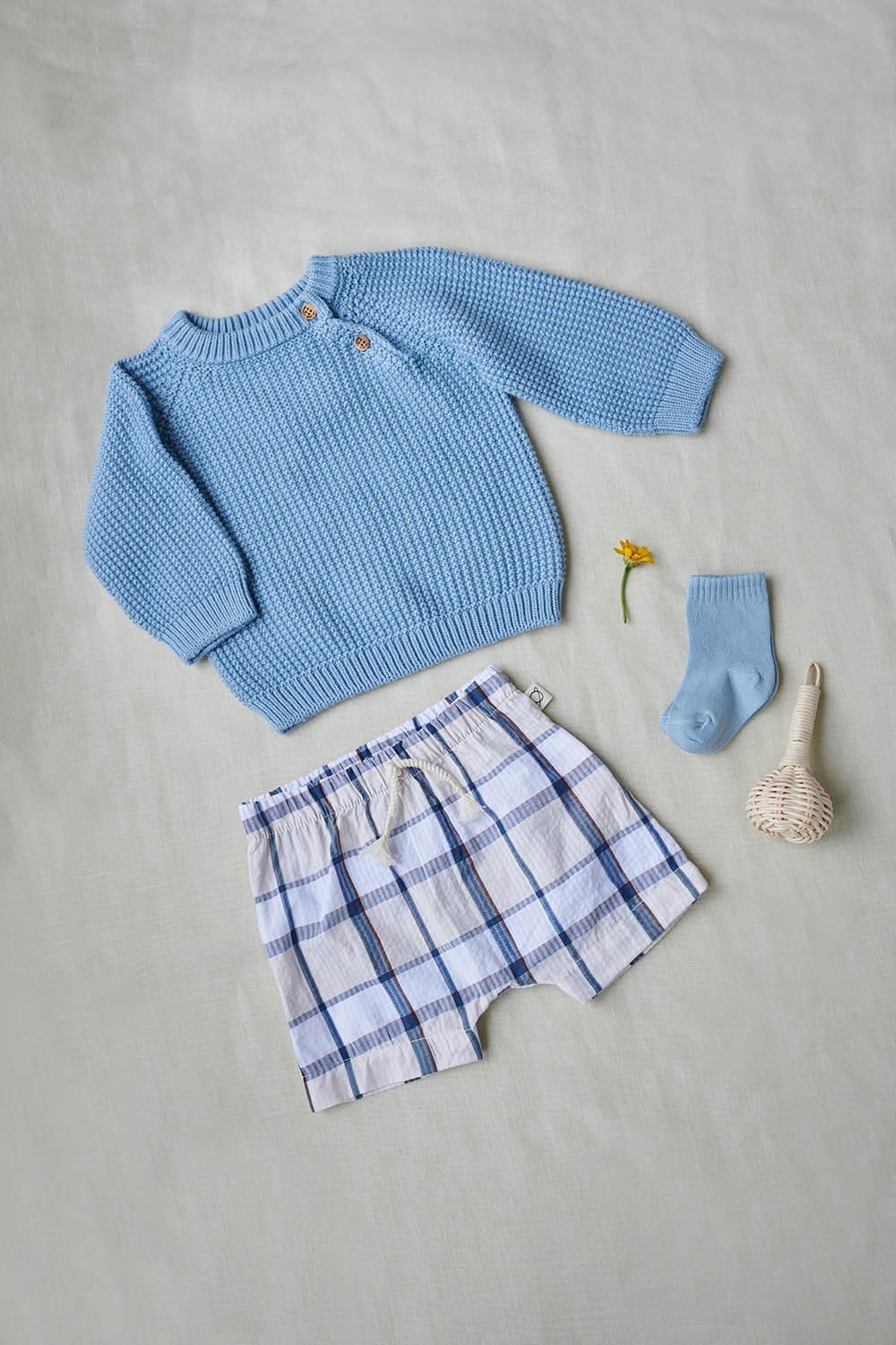 This organic waffle-knit baby pullover is a cozy cocoon. Plus, it looks great with everything and is a practical extra layer for indoors and outdoors. In short, it is a staple piece in every baby's wardrobe. This organic waffle-knit baby pullover features a crew neck, a diagonal row of buttons at the upper front, and long raglan sleeves. It is knitted in 100% OCS and OEKOTEX-certified organic cotton. Available in sky blue, coral, green, dark blue, and oil.