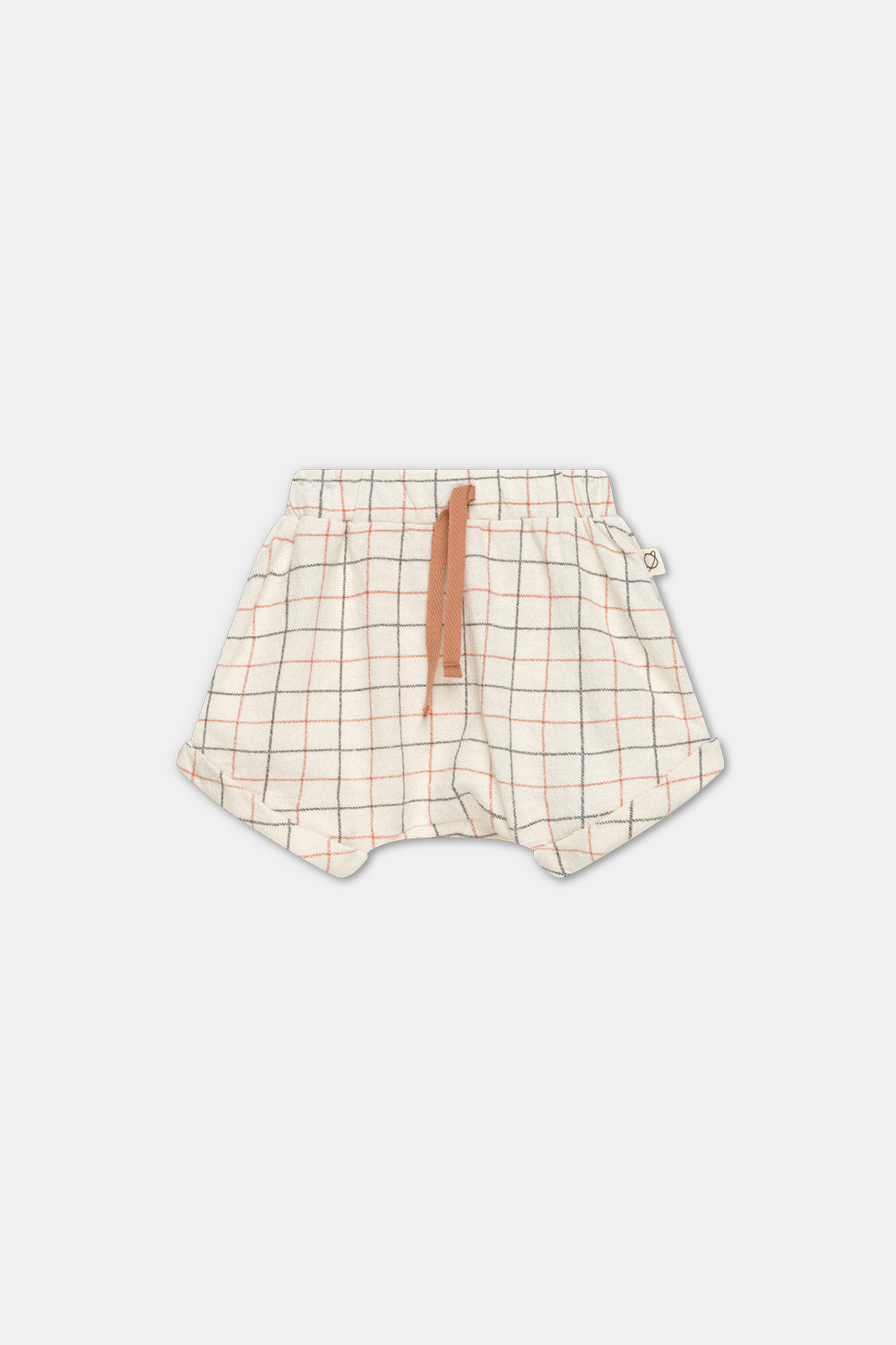 Organic crepe shorts in an all-over plaid pattern. They feature an elastic drawstring waistband and rolled-up hems.