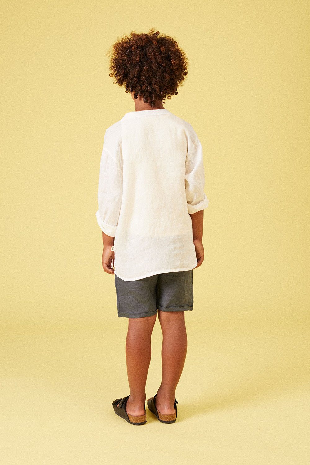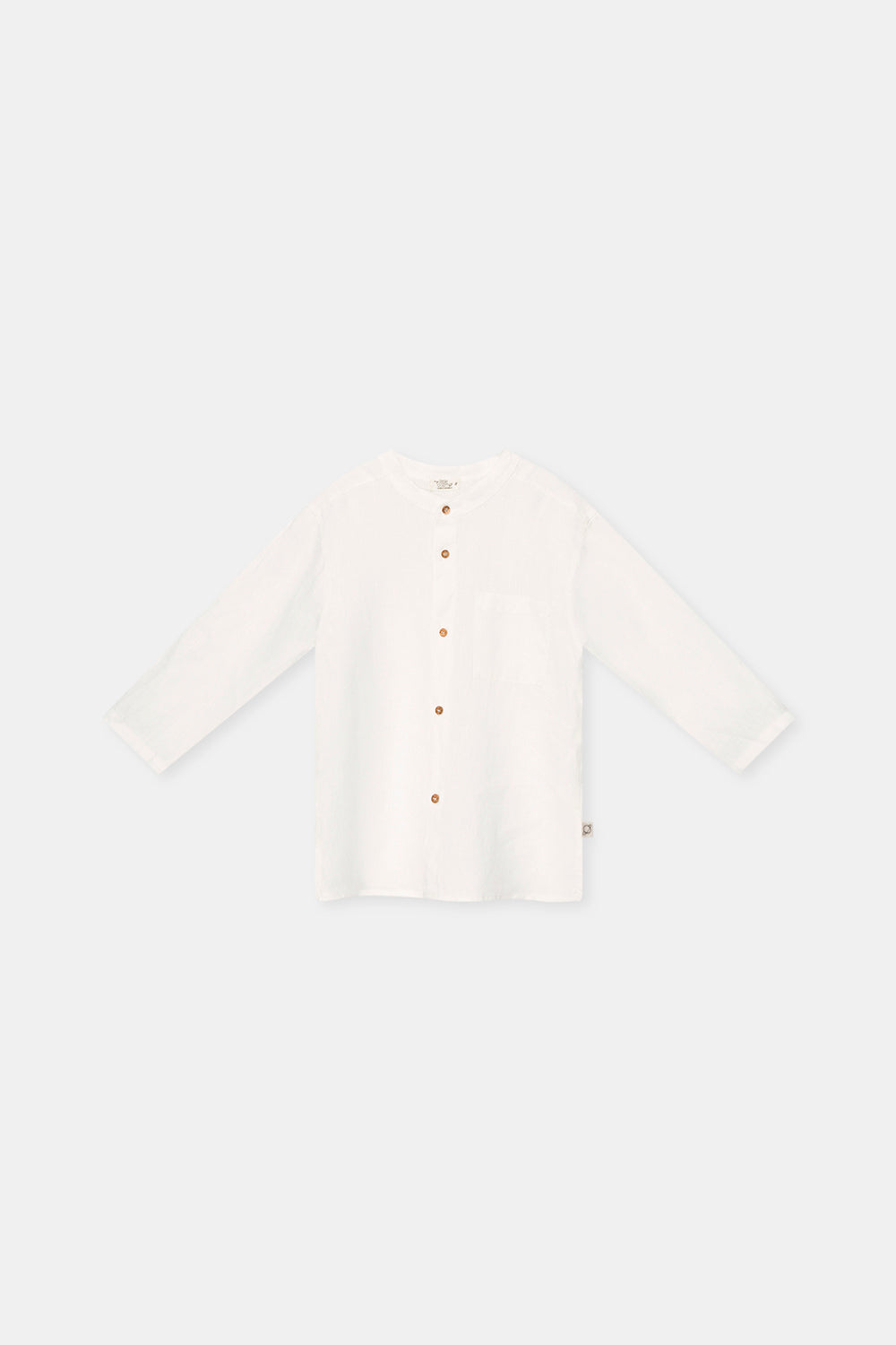 Linen shirt with a mao collar, long sleeves, a button placket at the front, side slits, and a patch pocket at the front.