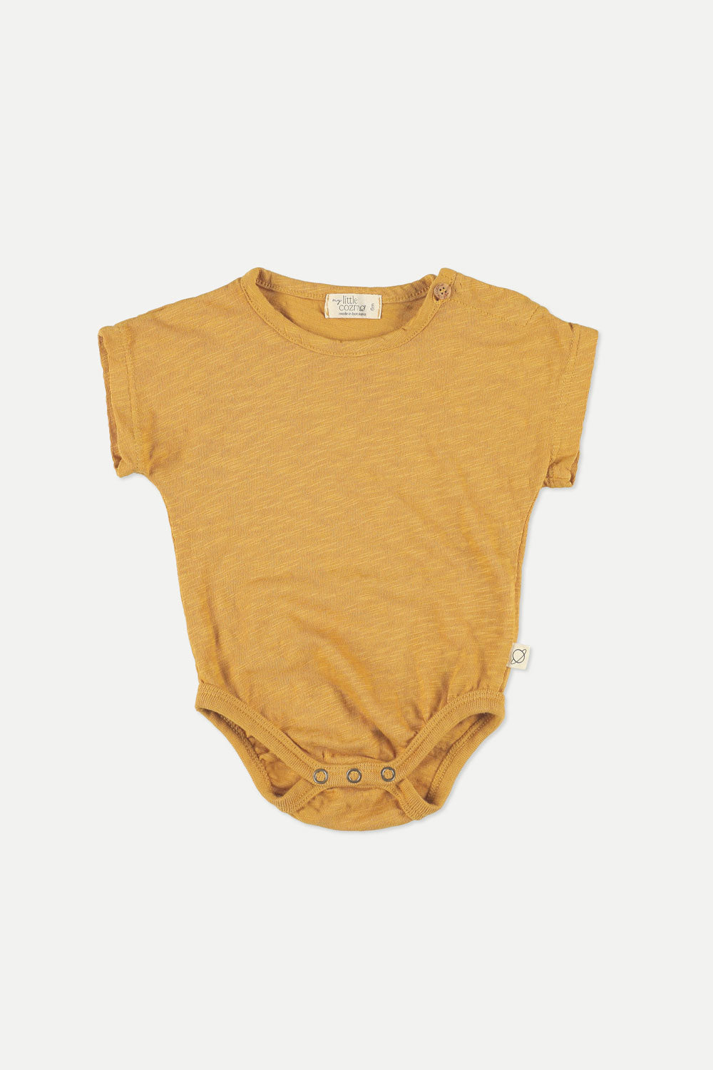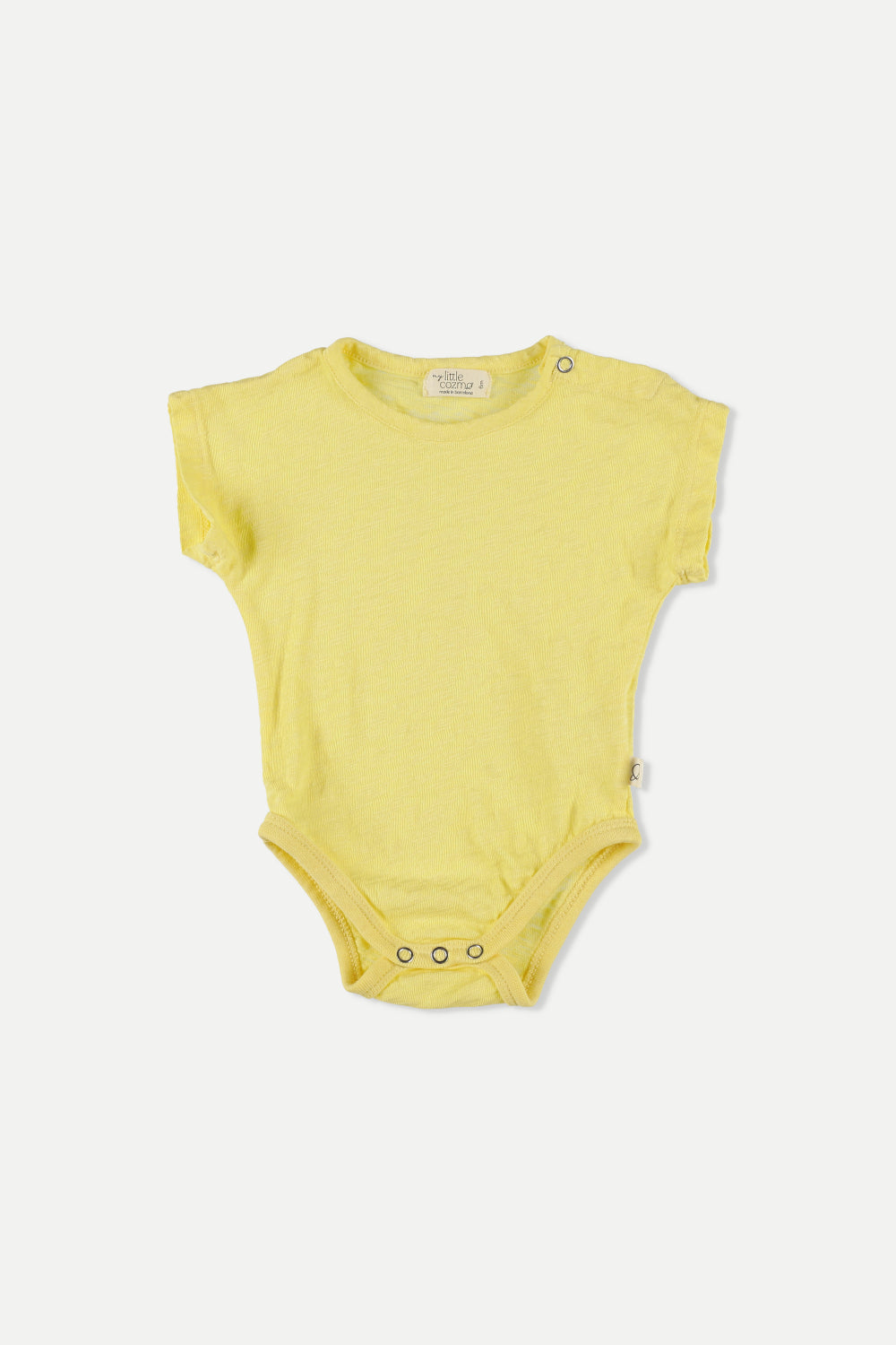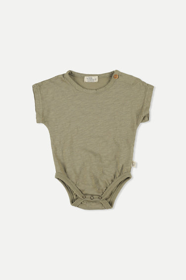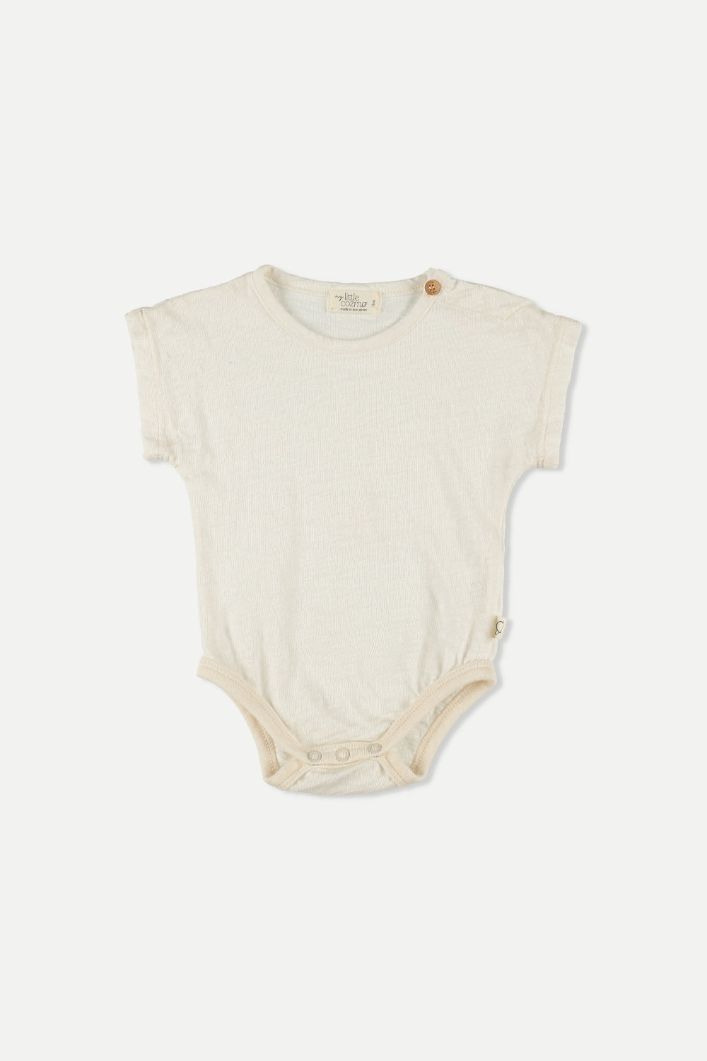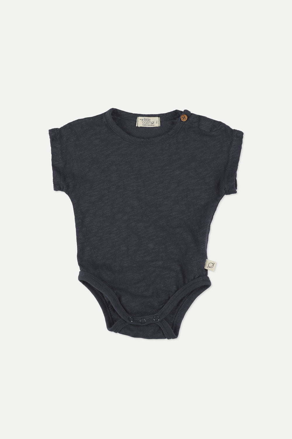 Bodysuit in lightweight and breathable organic slub cotton. Round neckline, buttons at shoulder, and short sleeves. Snap buttons at gusset. Garment-dyed. 100% organic cotton. Knit