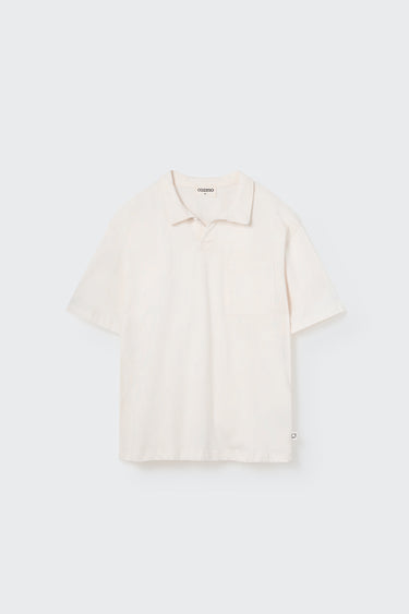 Unbuttoned Polo-style collar. Short sleeves. Patch pocket at the front. Contrasting striped fabric on the inside of the collar.
