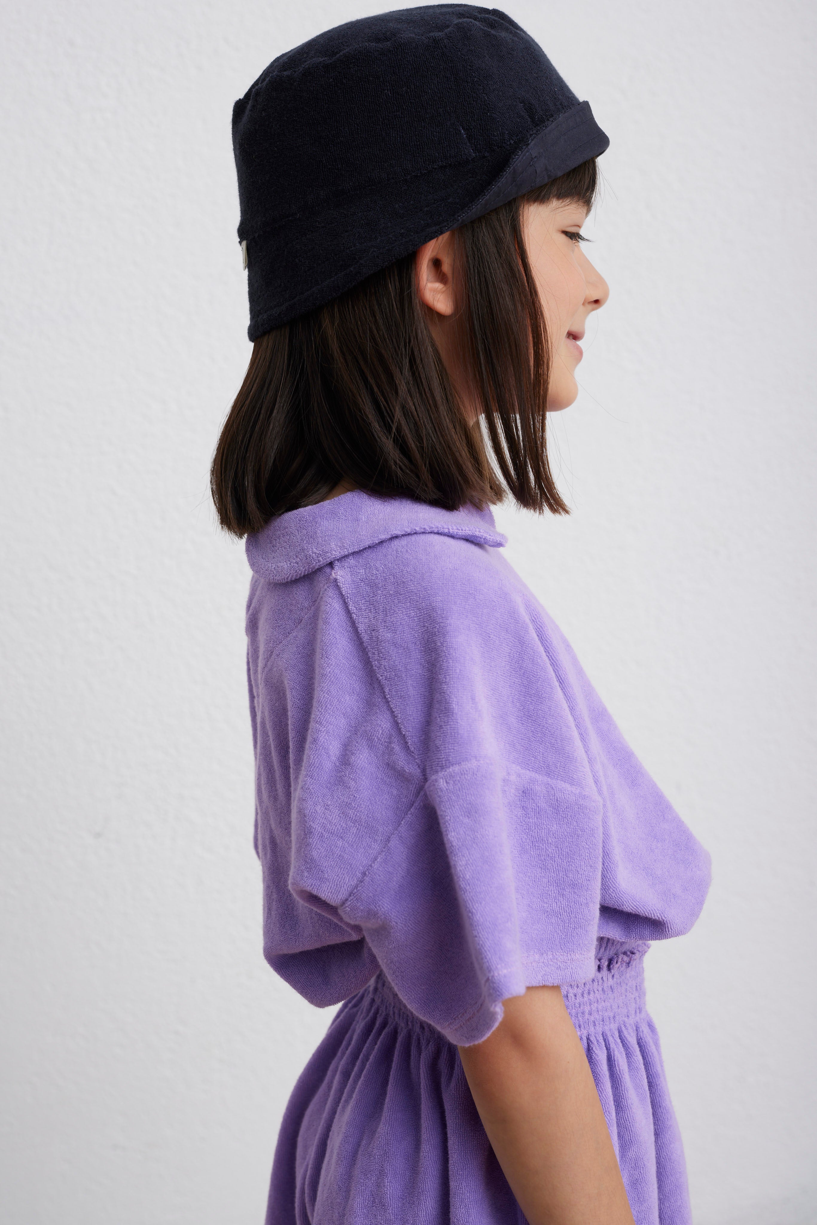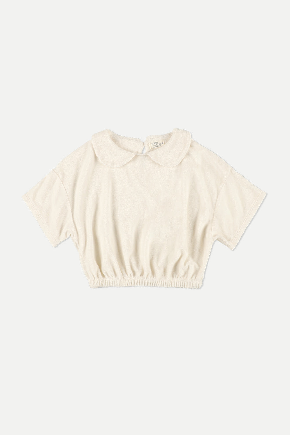 Top in a fluffy, comfy, organic cotton towel fabric. Peter Pan collar and keyhole closure at back. Dropped shoulders and short sleeves. Elasticized hem. Garment dyed. 85% organic cotton, 15% recycled polyester. Knit