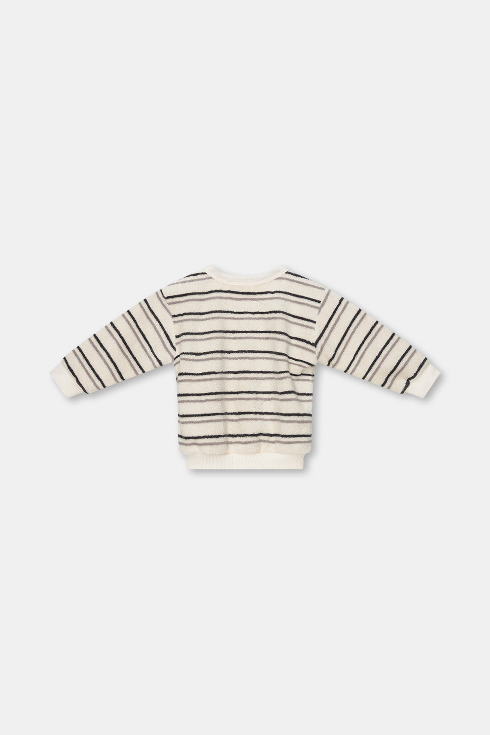 This striped, toweling sweatshirt has a V-shaped stitch at the neck and a button closure at the shoulder. Rib at the neck, V-insert, cuffs, and hem.