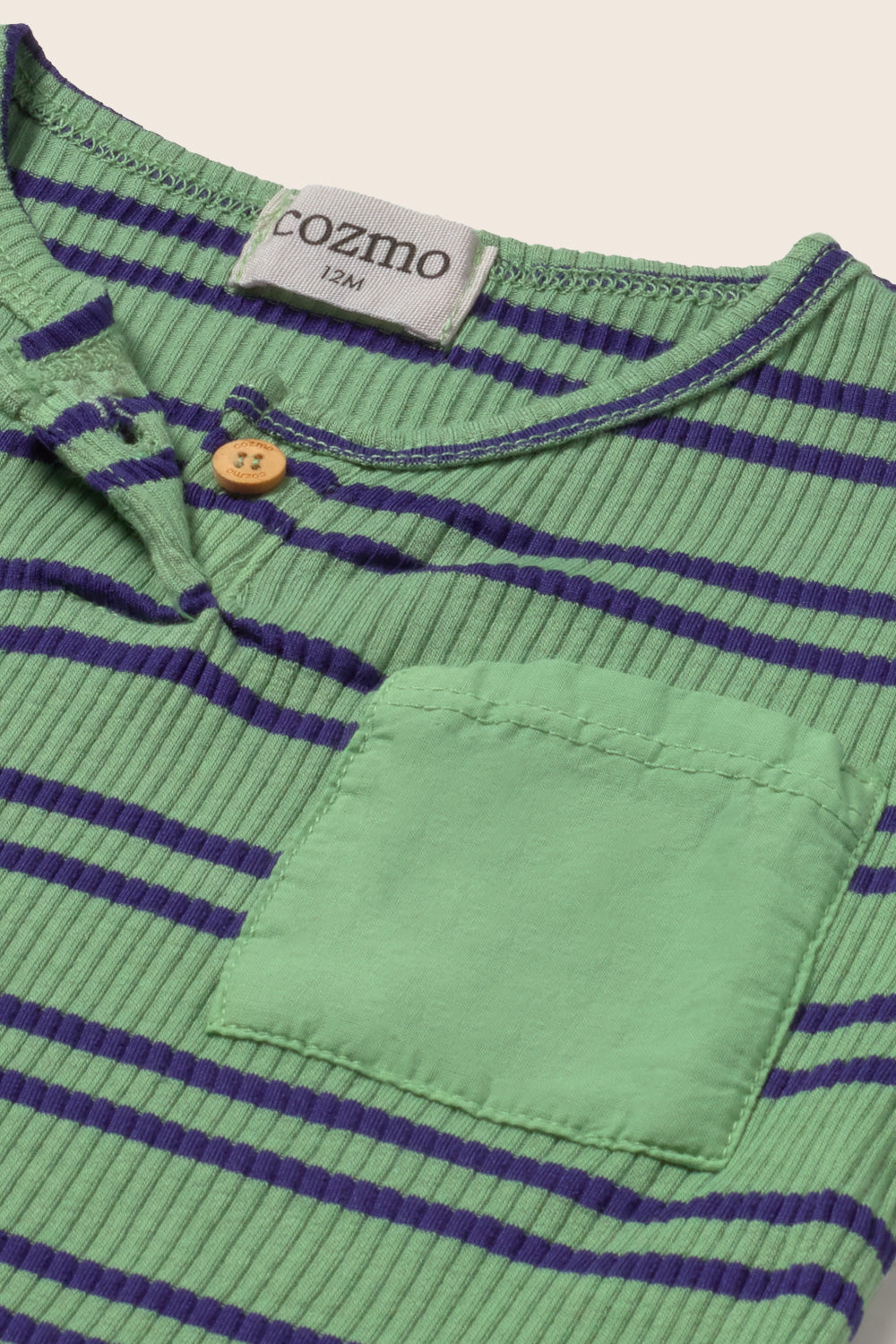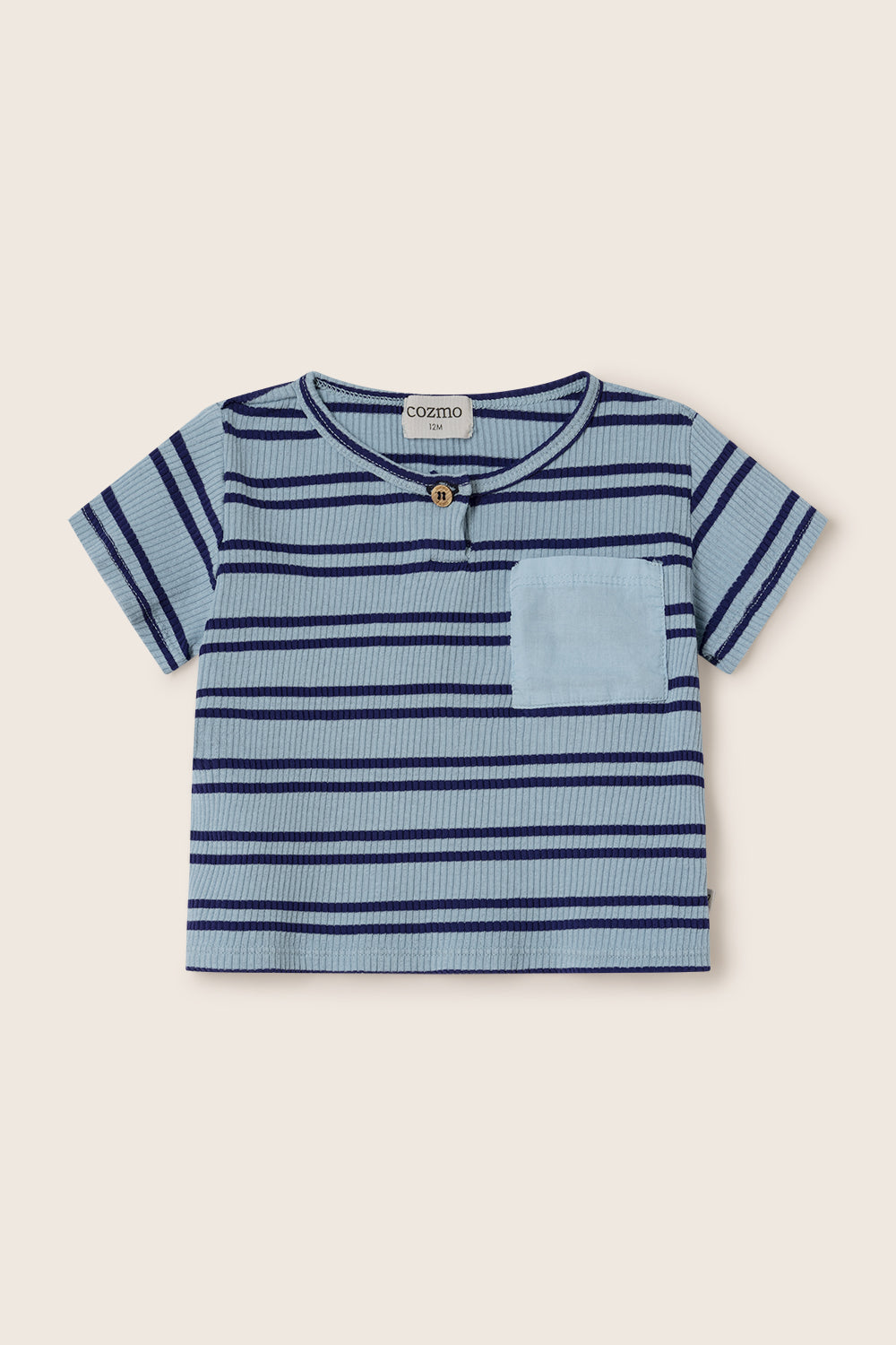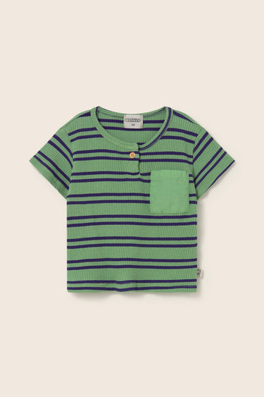 Striped baby boy T-shirt in comfortable, stretchy ribbed cotton. Round neckline with a button placket. Short sleeves. Patch pocket on the chest with a contrasting cotton voile fabric.