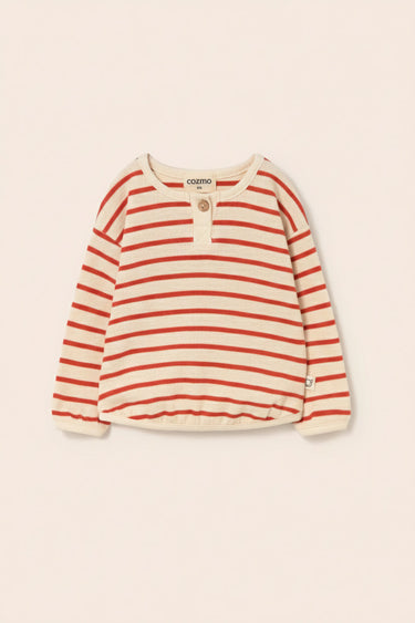Baby striped sweatshirt made from double-faced cotton. It features a round neckline with a button placket for easy dressing, dropped shoulders, and long sleeves. Finished with ribbed neck, cuffs, and hem, and a rounded hem for a comfortable fit.