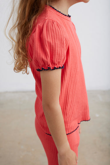 T-shirt in soft, comfy, rib-knit organic cotton. Round neckline and puffed short sleeves with elasticized cuffs. Navy, lettuce-edged trims. Garment-dyed. 96% organic cotton, 4% elasthane. Knit