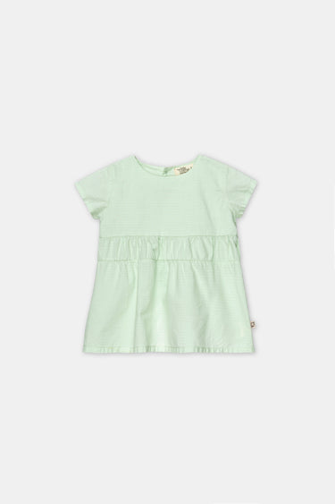 This light poplin dress has a round neck, short sleeves, a smocked waistband, and a button closure at the back.