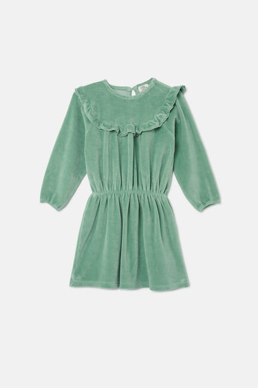 Velour dress with a rounded gathered yoke with ruffles and lace trims. Button closure at back. Elastic at waistline and cuffs. Extra soft and warm. 83% cotton,17% polyamide. Knit The fibers of this garment are certified as sustainable by the Better Cotton Initiative (BCI).