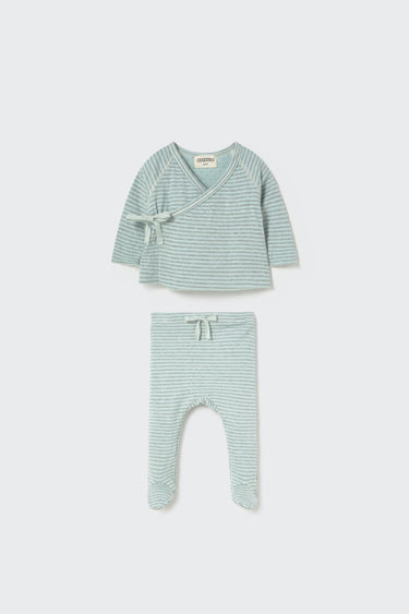 This striped two-piece set for newborns is crafted from double-faced soft jersey in 100% cotton—ideal for delicate skin. The wrap-over top offers gentle coverage with an easy, adjustable fit, while the matching footed pants keep little legs warm and snug. A cozy, practical, and timeless newborn first outfit