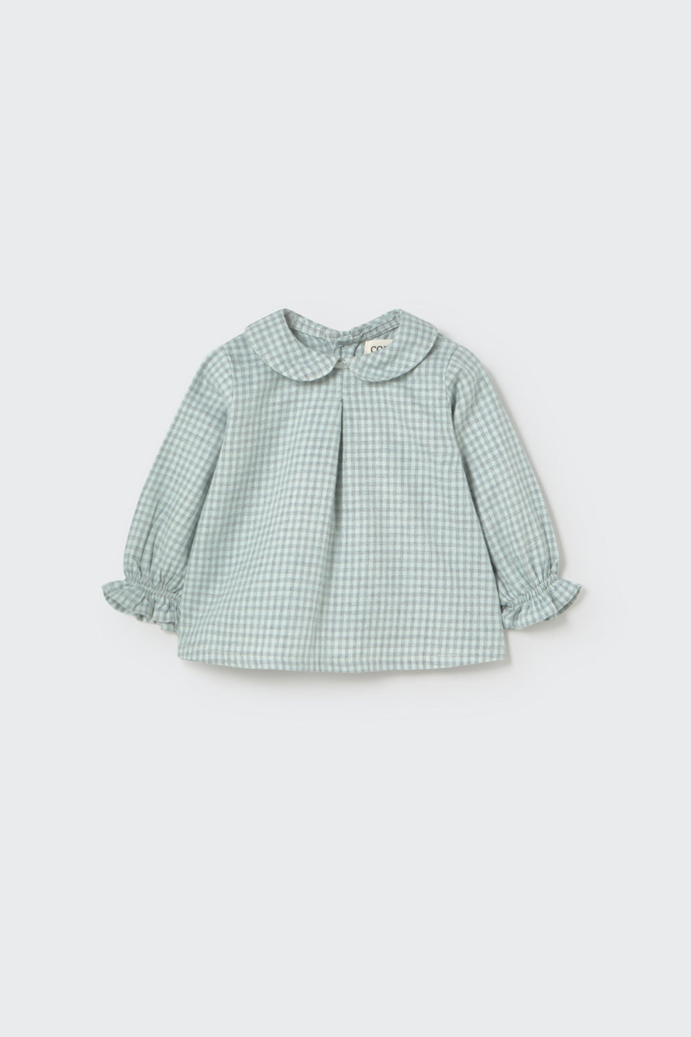 This newborn top is made from soft, brushed flannel in a classic gingham plaid pattern, using 100% sustainable cotton. It features a Peter Pan collar, front pleats, and a button-down closure at the back for easy dressing. Long puffed sleeves with elasticated cuffs are finished with a ruffle trim to ensure a secure and comfortable fit.