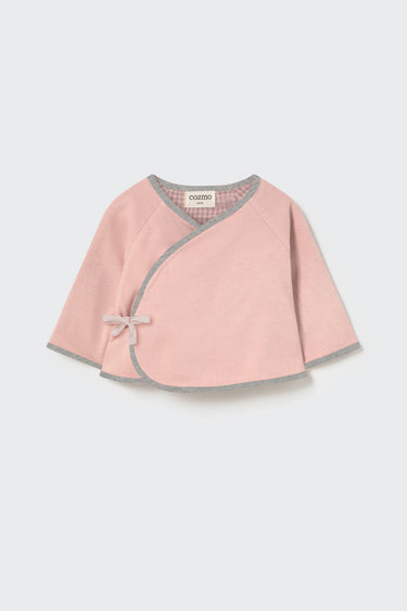 This newborn top is made from soft, brushed flannel using 100% sustainable cotton. It features a wrap-over closure that ties with ribbons at the front and secures with snap buttons on the inside. Binding along the edges offers a clean finish. Fully lined in gingham plaid flannel for added warmth and comfort.