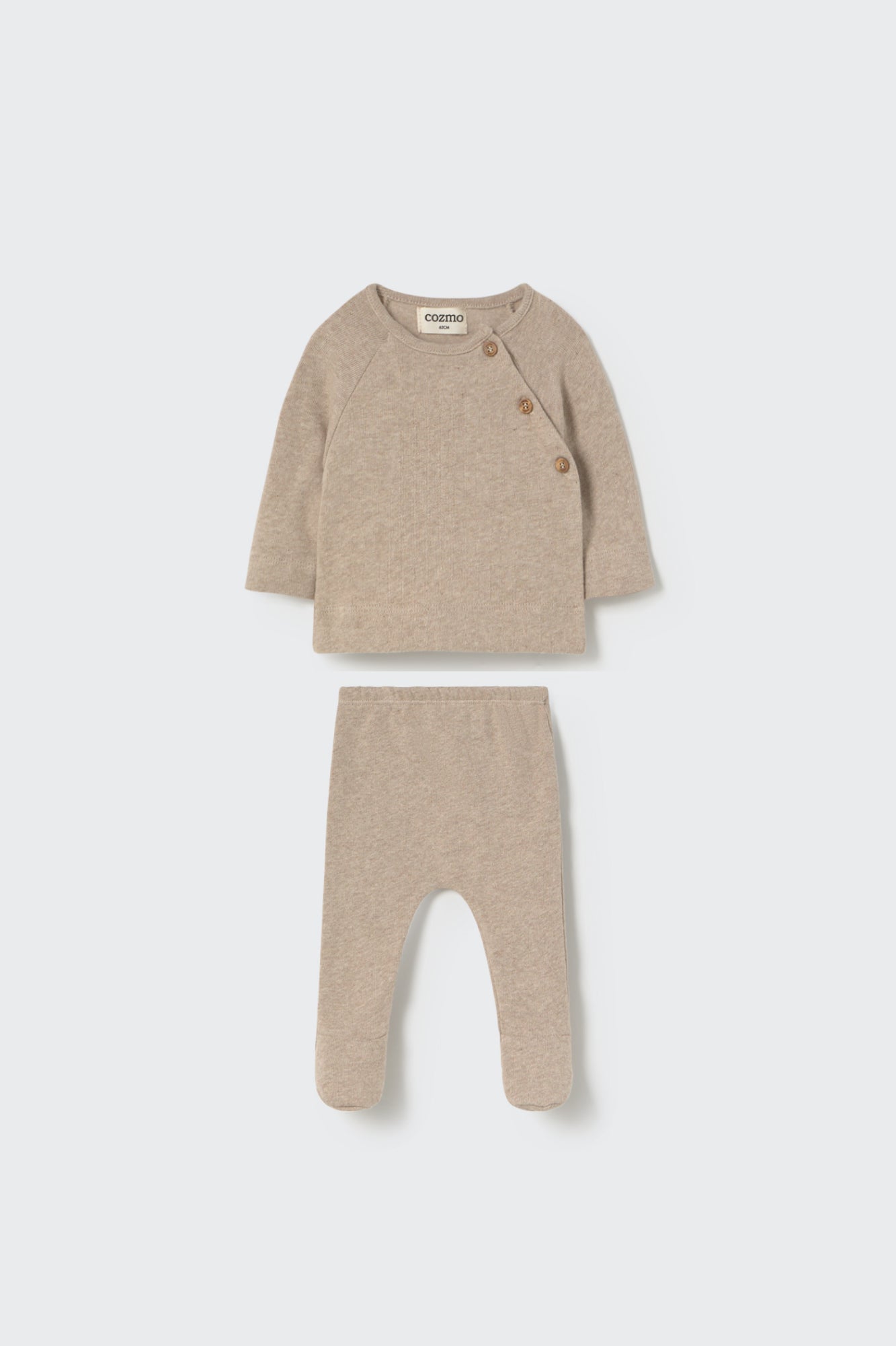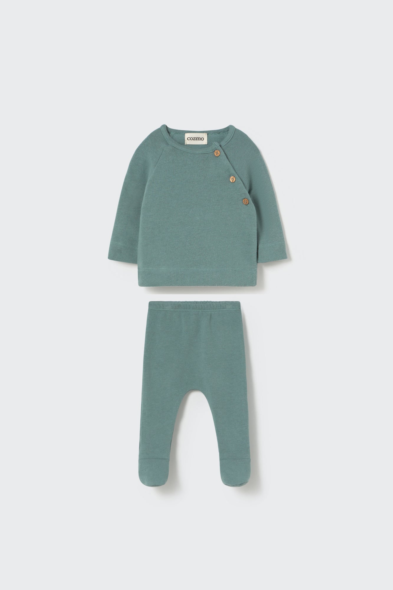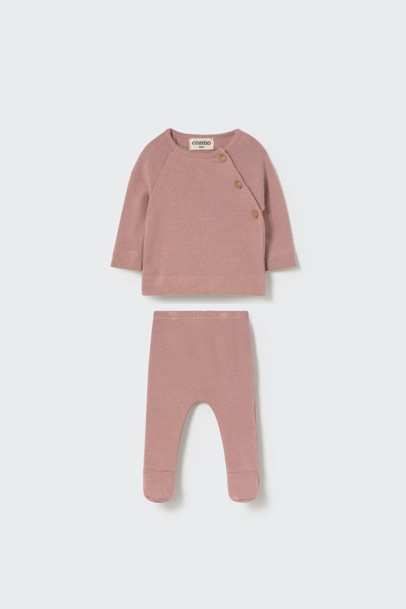 Two-piece newborn set featuring a wrap-over cardigan and matching footed pants in buttery-soft knit. Both pieces are brushed inside and out for exceptional warmth and comfort, keeping your baby cozy all day long.