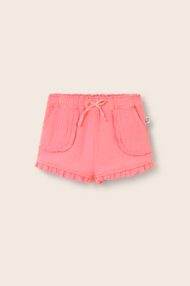 Baby and toddler girls’ gauze shorts with an elastic waistband and a decorative drawstring. They feature side pockets with ruffle details.