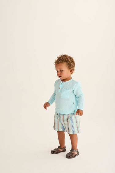 Baby and toddler boys’ striped shorts made from soft, comfortable cotton. They feature an elastic waistband, front pockets lined with “Cozmo” fabric, a back patch pocket with horizontal stripes, rolled-up hems, and front pleats for a classic fit.