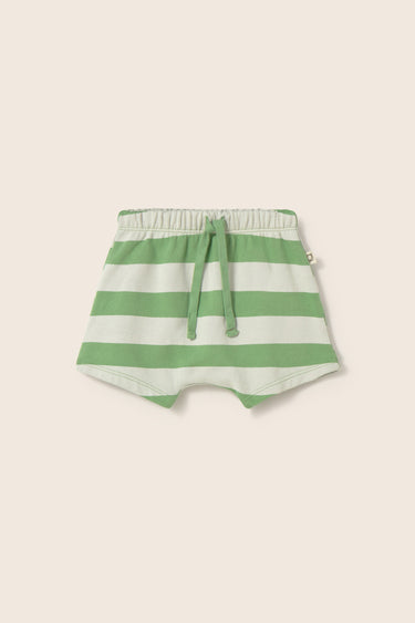 Baby and toddler striped shorts made from soft cotton fleece. They feature an elastic waistband with a decorative drawstring and a seamless crotch for extra comfort.