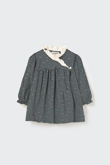 Soft flannel dress for baby girls, featuring a delicate floral pattern and subtle mélange effect. The wrap-over neckline is edged with lace trim for a sweet finish. Front and back yokes add classic detail, while long puffed sleeves with smocked cuffs and ruffle trim ensure a comfortable fit.
