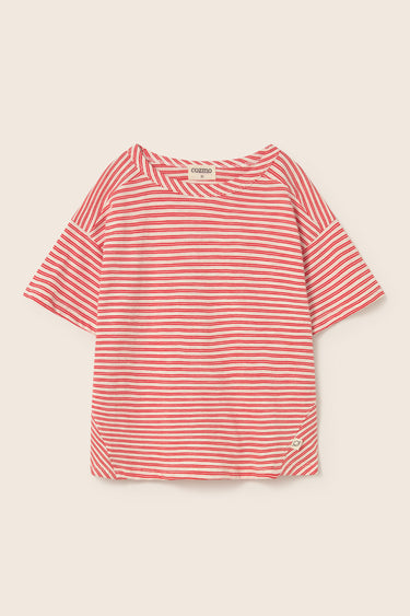 Boys’ striped T-shirt made from super breathable slub cotton. It features a round neckline, dropped shoulders with slightly forward seams, short sleeves, a chest patch pocket with diagonal stripes, and triangle inserts on the sides for a comfortable fit.