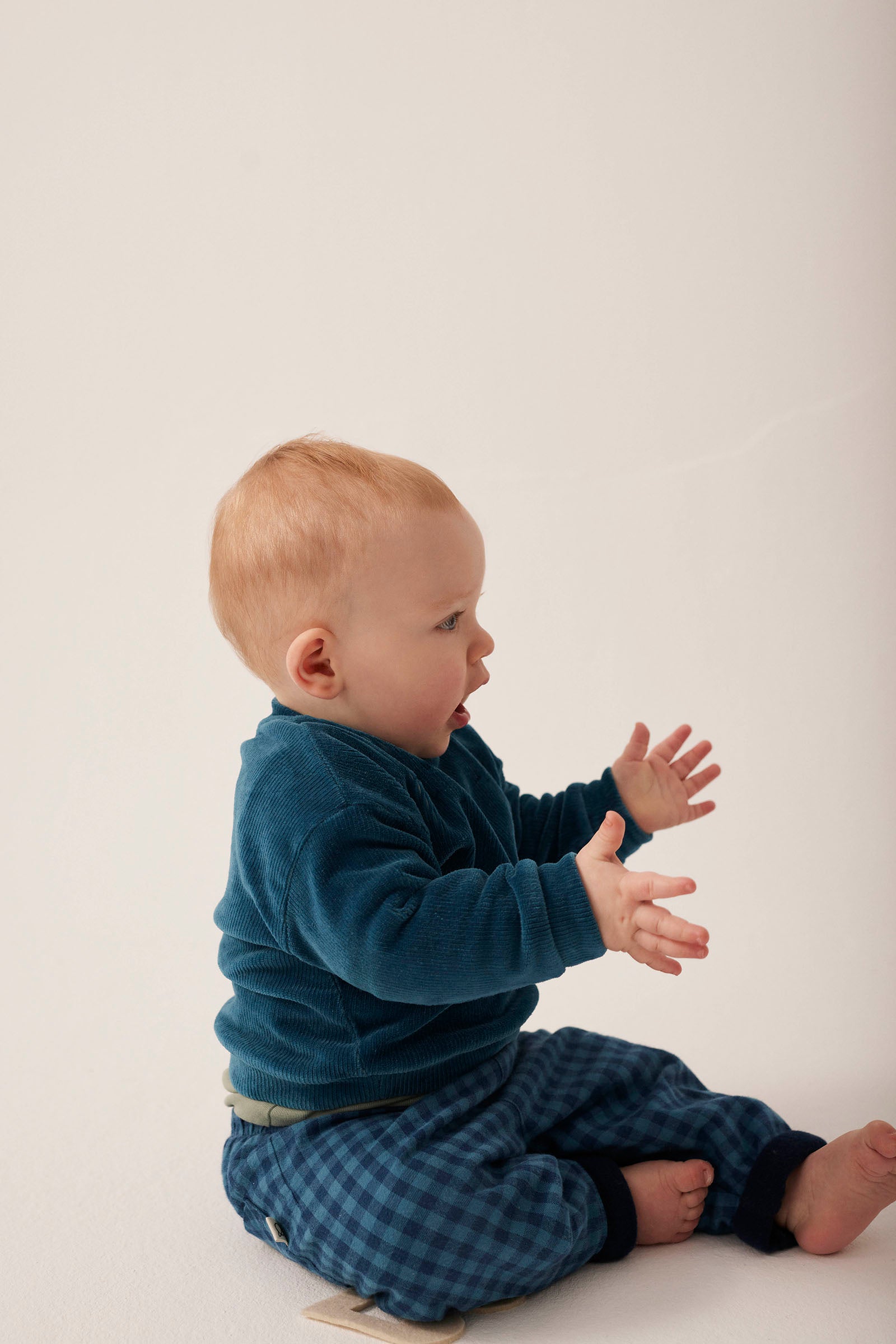 This sweatshirt for babies is made from knitted velour with a soft corduroy effect and an exceptionally gentle feel. Designed with a crew neckline, dropped shoulders, and forward side seams for a relaxed silhouette that allows freedom of movement. Crafted from GOTS-certified organic cotton to care for delicate skin and the planet. Cozy, stylish, and perfect for everyday layering.