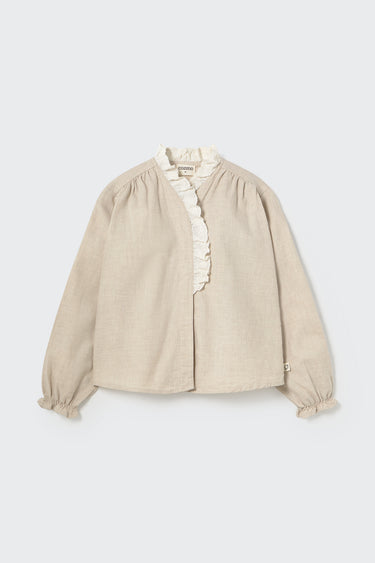 This girls’ blouse is made from soft cotton flannel with a subtle mélange effect, crafted from 100% sustainable cotton. It features lace trim along the neckline and front closure, with concealed buttons on the inside for a clean finish. Designed with slightly forward shoulder seams, long sleeves with elasticized cuffs, and a delicate ruffle trim. A back yoke adds structure and comfort.