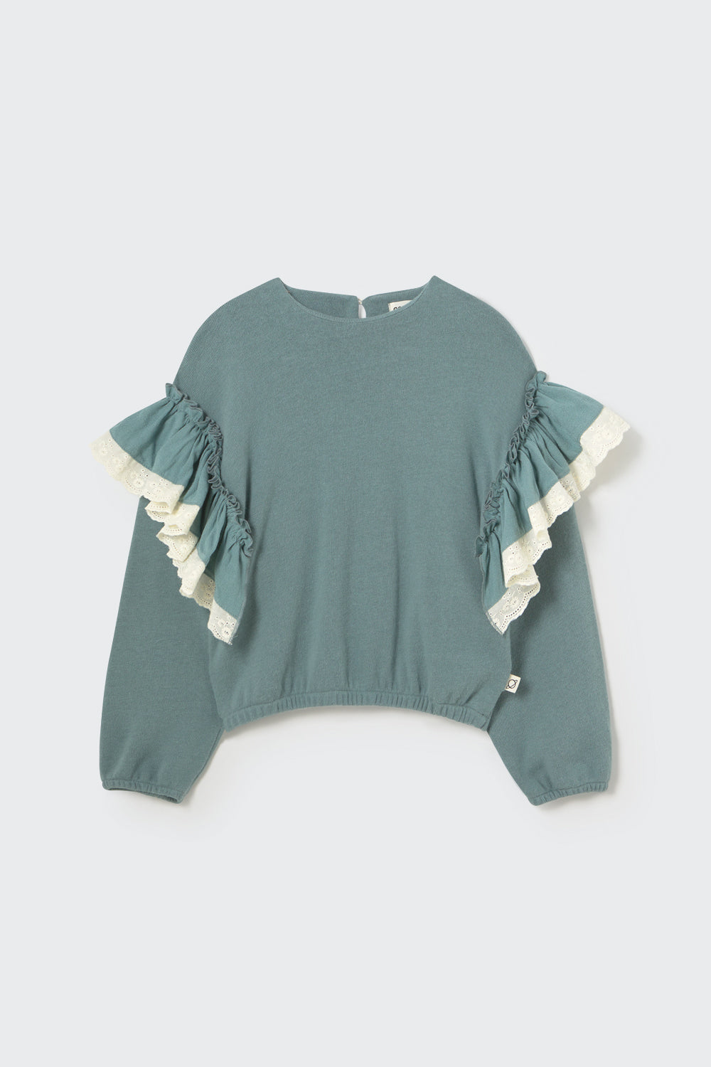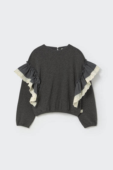 Girls’ sweatshirt in a buttery-soft knit. Round neckline, dropped shoulders, and elasticized cuffs and waistline. Ruffles over the shoulders with lace detail. Brushed inside and out to provide a warm, toasty finish—perfect for keeping her cozy throughout the day.